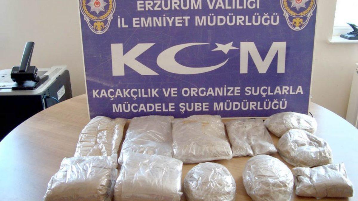 Erzurum Emniyet Müdürlüğü Kaçakçılık ve Organize Suçlarla Mücadele Şube Müdürlüğü (KOM) ekipleri, şehirlerarası bir seyahat firmasına ait yolcu otobüsündeki şüphe üzerine üst araması yaptıkları iki kadının üzerinde 5 kilo 635 gram eroin ele geçirdi. KOM ekipleri Erzurum- Pasinler çevre karayolunda Ağrı istikametinden seyretmekte olan yolcu otobüsünü durdurdu. Otobüste yolculuk etmekte olan P.K. ve L.A. isimli kadınların şüpheli davranış sergilemesi üzerine, KOM'da görevli bayan polisler şüpheli hemcinslerini otobüsten indirip üst araması yaptı. Yapılan aramada P.K. ve L.A. isimli kadınların vücutlarının belirli bölgelerine tülbentle sarılı vaziyette 11 parcça halinde 5 kilo 635 gram eroin ele geçirildi. Cumhuriyet Savcısının talimatıyla göz altına alınan P.K. ve L.A, "Uyuşturucu Madde Ticareti Yapmak ve Nakletmek" iddiasıyla sevk edildikleri adli makamlarca tutuklanarak cezaevine gönderildi.
