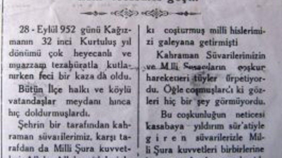 28-Eylül 952 günü Kağızman’ın 32 inci Kurtuluş yıl dönümü çok heyecanlı ve muazzam tezahüratla kutlanırken feci bir kaza da oldu.