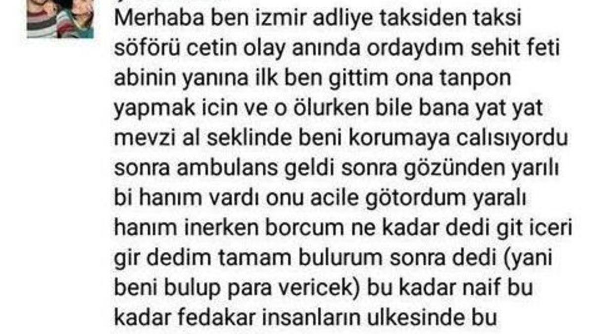 İzmir’deki terör saldırısında katliamın önüne geçen ve şehit olan polis Fethi Sekin’in yardımına koşan bir taksici, "Fethi ağabeyin yanına ilk ben gittim ona tampon yapmak için. Ölürken bile bana ’yat yat mevzi al’ şeklinde korumaya çalıştı" dedi.İzmir’de gerçekleşen ve bir polis ile bir adliye çalışanının şehit olduğu, 9 kişinin yaralandığı hain terör saldırılarının ardından daha fazla kişinin ölmemesi için canını feda eden şehit polisi memuru Fethi Sekin’in son onlarına tanıklık eden taksici Çetin Yenel, yaşadığı anları sosyal medya hesabından paylaştı.Olayın ardından polis memurunun yanına koştuğunu belirten Yenel, "Fethi ağabeyin yanına ilk ben gittim. Ona tampon yapmak için. Ölürken bile bana ’yat yat mevzi al’ şeklinde korumaya çalıştı" dedi. Duygulandıran mesajı sosyal medya hesabından paylaşan taksici Çetin Yenel, yaşadığı bir anısına da mesajında yer verdi.“Bu kadar fedakar insanların ülkesinde bu bombalar etkisiz olur"Yaralı bir kadını hastaneye götürdüğünü anlatan Yenel, "Ambulans geldi. Sonra gözünden yaralanan bir hanım vardı. Ona hastaneye götürdüm. Yaralı hanım inerken, ’borcum ne kadar’ dedi. ’Sonra bulurum’ dedi; yani beni bulup para verecek. Bu kadar naif, bu kadar fedakar insanların ülkesinde bu bombalar etkisiz olur" şeklinde konuştu.