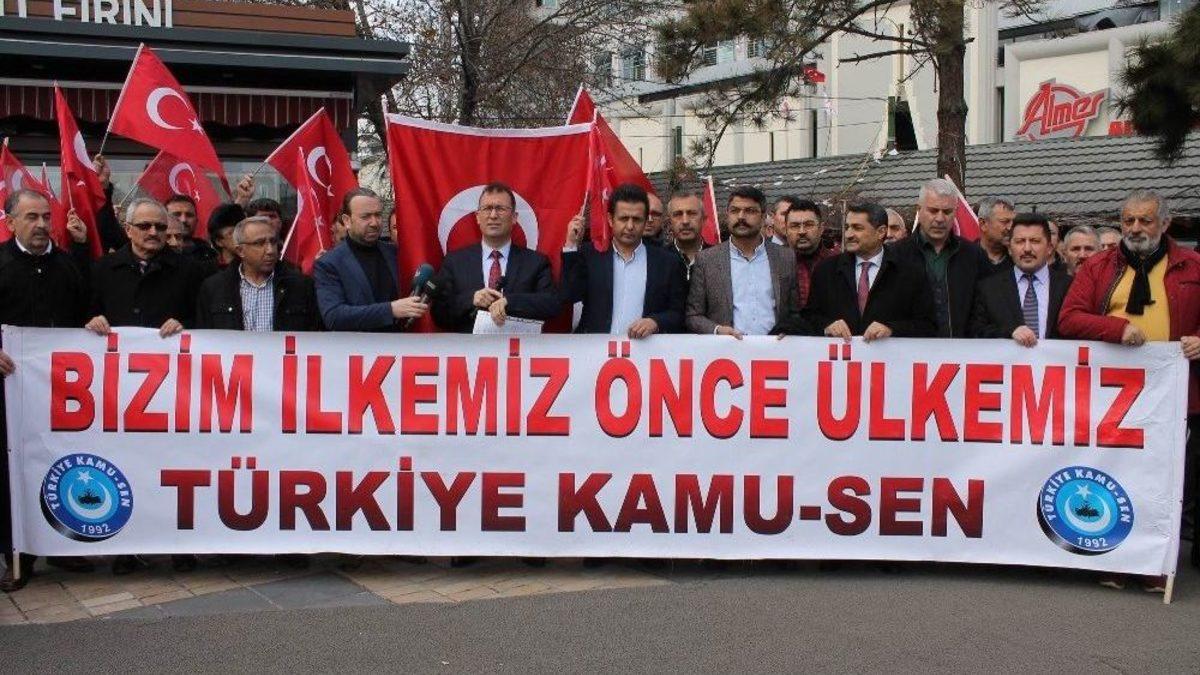 Türkiye Kamu Çalışanları Sendikaları Konfederasyonu (Kamu-Sen) Kayseri İl Temsilciliği Afrin Operasyonuna destek vermek için basın açıklaması yaptı.Cumhuriyet Meydanında gerçekleştirilen basın açıklamasında konuşan Kamu-Sen İl Temsilcisi Ünal, 400 bin Kamu-Sen üyesinin Afrin Operasyonuna destek verdiğini söyledi. Ünal, açıklamasında şu ifadelere yer verdi:“Yaklaşık 30 yıldır, yavaş yavaş, merhale merhale yurdumuzu kuşatan güçler, maşa olarak kullandıkları terör örgütleri yoluyla Türk milletini yıpratmak, zayıflatmak, son darbe ile yok etmek ve tarih sahnesinden silmek üzere ortaya koydukları planlarını devreye sokmuşlardır. Milletimiz ve binlerce yıldır sayısız şehidimizin kanıyla sulayarak vatan yaptığımız bu topraklar, hainlerin, bebek katili terör örgütlerinin, eli kanlı milletlerin yaktığı ateşle çepeçevre sarılmıştır. Yakın coğrafyamızda olup bitenlere bu gözle baktığımızda, asıl hedefin Türkiye Cumhuriyeti ve Türk milleti olduğunu görmek çok da zor değildir. Kahraman Mehmetçiğimizin Afrin’de yürüttüğü bu harekat, Türk milleti üzerinden İslam’ı boğma amacındaki alçaklara karşı yapılan bir huruç harekatıdır. Nasıl ki, Kurtuluş Savaşı’nda Yunan kisvesi altında yedi düvelle savaştıysak bugün de YPG/PKK kılığına girmiş, yanı başımızda çöreklenmiş ve boğazımıza sarılmak için fırsat kollayan kahpe emperyalist güçlerle savaşmaktayız. Bu nedenle Sakarya, Dumlupınar, İnönü bizim için ne anlam ifade ediyorsa, El Bab da, Afrin de, Münbiç de, Sincar da, Kandil de aynıdır.Türk milleti bugün 80 milyon tek yürek, tek bilek, kahraman Mehmetçikle beraber Afrin’e yürümeye hazırdır. Bugün 80 milyon seve seve şehadet şerbetini içmeye hazırdır. Biz, askeriyle, milletiyle bir ve bütün olarak devletimizin ve devlet büyüklerimizin yanında, alacakları her kararın sonuna kadar arkasındayız.”