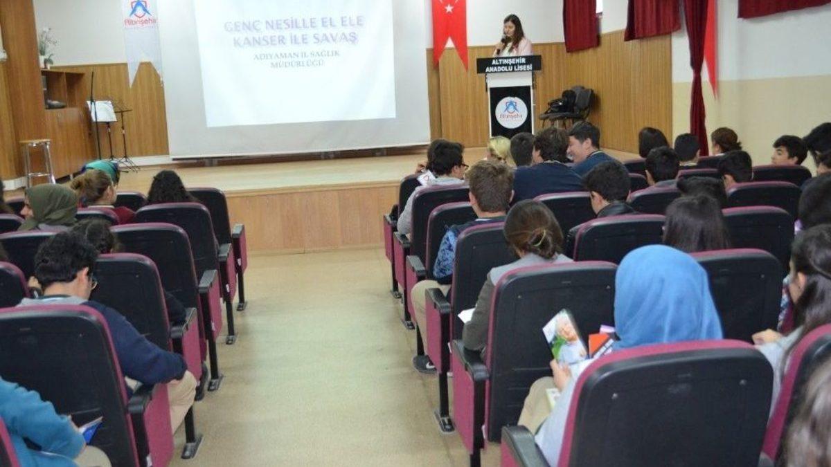 Adıyaman İl Sağlık Müdürlüğü tarafından Altınşehir Anadolu Lisesinde kanserden korunmanın yolları, erken teşhisin önemi ve KETEM faaliyetlerinin anlatıldığı seminer düzenlendi.Seminerde meme, rahim ağzı ve kalın barsak kanserinin kanser tarama programı kapsamında KETEM ve aile hekimlerince ücretsiz olarak tarandığı vurgulandı.Aynı zamanda seminerde katılımcılara meme kanseri taraması için 40 -69 yaş aralığında kadınların her 2 yılda bir mamografi çekmesi, rahim ağzı kanseri taraması için 30 -65 yaş aralığındaki kadınların 5 yılda bir HPV testi yaptırması ve kalın barsak kanseri taraması için 50 -70 yaş aralığındaki tüm bireylerin 2 yılda bir dışkıda gizli kan testi yaptırması gerektiği anlatıldı.Lise öğrencilerinden kanserden korunmak için yaşam tarzlarına ve beslenmelerine özen göstermeleri gerektiği ve ailelerindeki ve çevrelerindeki yetişkinleri kanser taramaları için KETEM’e yönlendirmelerinin önemli olduğu söyledi.