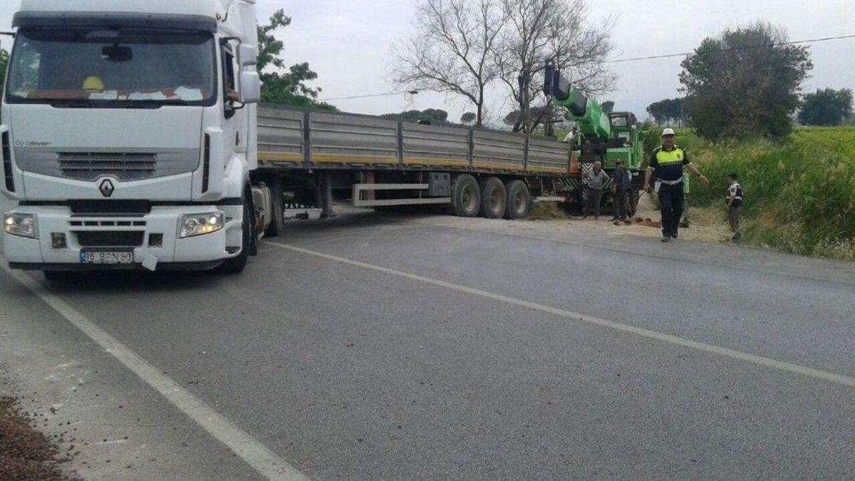 2 ton fazla yük yükleyerek yola çıkan tır sürücüsü kantara yakalanmamak için arazi yollarından geçmek isteyince, ana yola çıkışı esnasında devrilerek yan yattı. Şarampole yan yatan tır, Manisa-Alhisar istikametindeki trafiği 4 saat kilitleyerek felç etti. Kaza sebebiyle kilometrelerce araç kuyruğu oluştu.Kaza, Manisa-Akhisar karayolu Saruhanlı Yılmaz Köprüsü yakınlarında meydana geldi. Alınan bilgiye göre, Kazım Çelik yönetimindeki 16 BNP 83 plakalı tır tali yoldan ana yola çıkmak istediği sırada tırın dorsesi şarampole yan yattı. Şarampole yan yatan tır Manisa-Akhisar karayolunu trafiğe 4 saat kilitleyerek felç etti. Kaza sebebiyle kilometrelerce araç kuyruğu oluştu. Kaza yerine gelen vinç yardımıyla tır şarampolden kurtarılarak yol trafiğe açıldı.İddiaya göre, 2 ton fazla yük yükleyerek yola çıkan tırın sürücüsü Kazım Çelik, kantara yakalanmamak için arazi yollarından geçmek istemesi üzerine ana yola çıkışı esnasında tırı şarampole yan yatırdı. Aracın bir kısmıyla yolu kapatan tır 4 saat trafiği felç etti. Kaza sebebiyle Manisa-Akhisar karayolunda kilometrelerce uzayan konvoy oluştu.