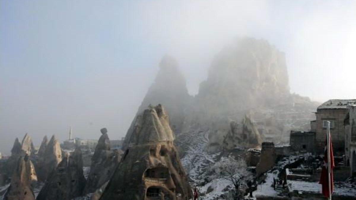 NEVŞEHİR, Her mevsim ayrı bir güzelliklere bürünen peribacaları ise fotoğraf meraklıların ilgisini çekti. Sisin altında silüet görüntüsü veren Peribacaları ilginç görüntülere sahne oldu. Merkeze bağlı Uçhisar ve Göreme beldelerindeki karla kaplı Peribacaları, üzeri sisle de kaplanınca turistlerin ilgisini çekti. Turistler uzun süre bölgede fotoğraf çekti.