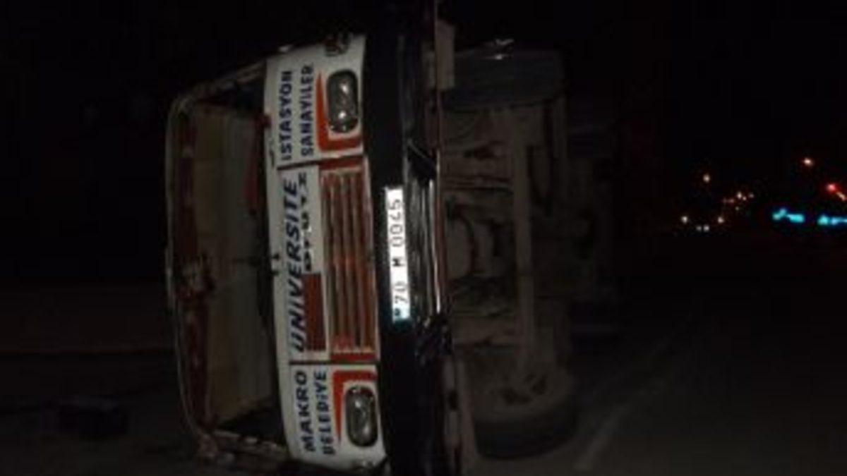 Karaman'da kontrolden çıkarak devrilen hat minibüsünün sürücüsü ağır yaralandı.
