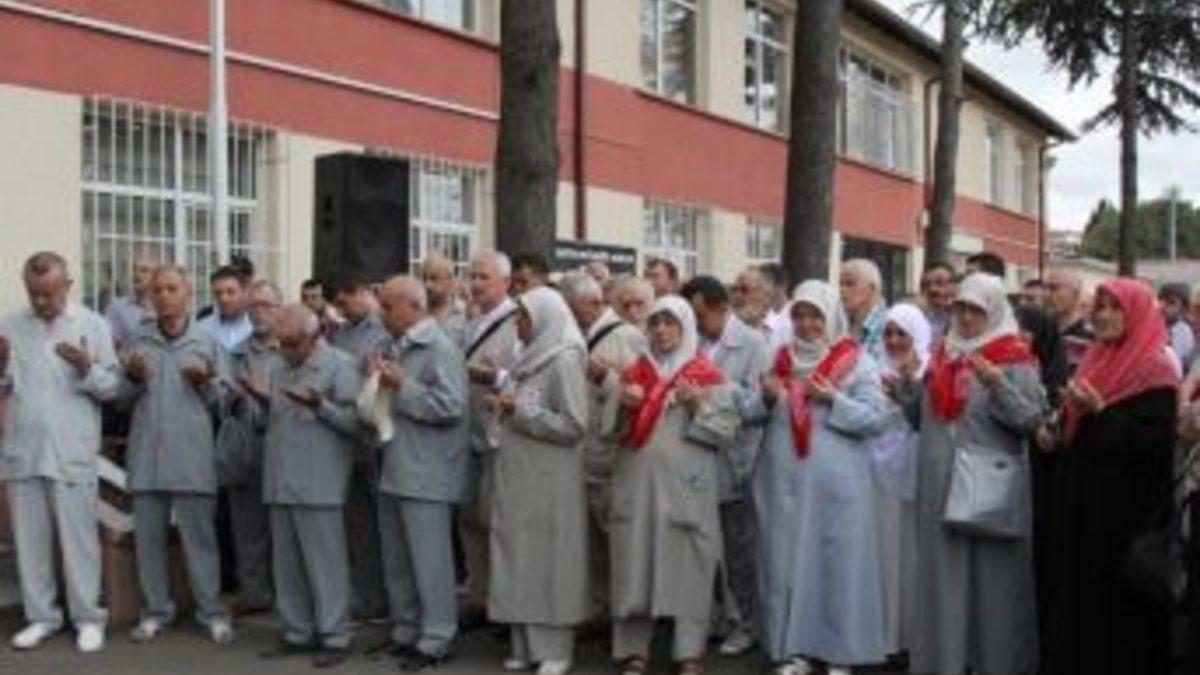 Diyanet İşleri Başkanlığı kontenjanından kutsal topraklara gidecek olan Karamürselli hacı adayları İmam Hatip Ortaokulu bahçesinde...