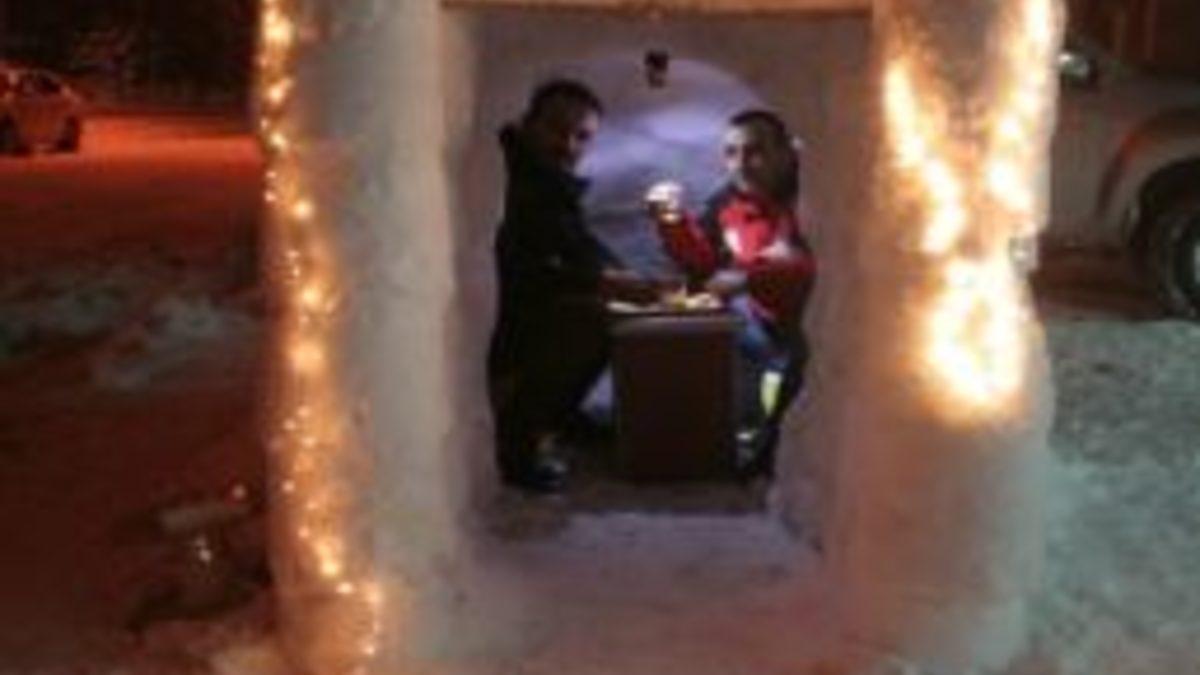 Erzincan'da bir esnaf dükkanının önünde yaptığı kardan evde çay keyfini çıkarıyor. Rengarenk ışıklarla süslenen kardan eve vatandaşlar da büyük ilgi gösteriyor.