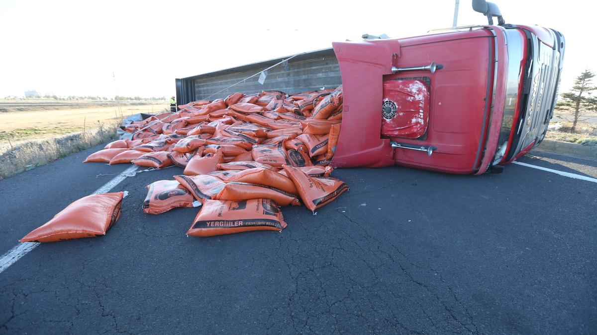 Yan yatan tırdaki yemler yola savruldu, Ardahan'a gidiş istikameti ulaşıma kapandı.