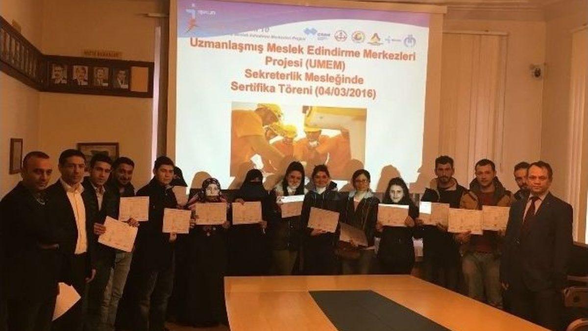 Kars Çalışma ve İş Kurumu İl Müdürlüğü’nce Finanse edilen İşsizlere meslek ve firmalara nitelikli eleman kazandırılması, İstihdam sorununa çözüm bulunmasını amaçlayan Uzmanlaşmış Meslek Edindirme Merkezleri (UMEM) Projesi kapsamına açılan Sekreterlik mesleğinde başarılı 25 kursiyere sertifikaları; Kars Ticaret ve Sanayi Odası Başkanlığı’nda düzenlenen törenle verildi.Sertifika törenine UMEM Kurs yönetiminde yer alan Ticaret ve Sanayi Odası Genel Sekreter Ali Ekber Turan, Kars Çalışma ve İş Kurumu İl Müdürlüğü’nden Muhasebeci V. Levent Akkoçan, Kars Mesleki ve Teknik Anadolu Lisesi Okul Müdürü Kadir İnan Bilgir ve G.A.M.P. Mesleki ve Teknik Anadolu Lisesi Müdürü İshak Tepebaş ve Ticaret Borsası’ndan Adem Moco katıldı.UMEM kapsamında Sekreterlik mesleğinde açılan ve 20 gün süren eğitimi tamamlayan kursiyerler Günarhan Kırtasiye ve Sensör Tic., Erdağı Mimarlık San.Tic.Ltd.Şti., Rehber Kalemler Eğitim Araştırma Kült. ve Yardımlaşma Derneği, Avukat Aytaç Gökçek Erdağı, Avukat Bülent Özmen, Avukat Sinan Erdağı, Yardımcı İnş.Taah. Onur Alp, Rehber Kalemler Eğitim Araştırma Kült. ve Yardımlaşma Derneği, Yalçın Eczanesi, Oruçoğlu Madencilik Gıda İnş.San.Tic..Ltd. Şti., Yapınoğulları Emlak ve Canlar Temizlik İnş.San.Tic. Ltd.Şti. firmalarında 140 gün süreyle İşbaşı Eğitimi Programına devam etmekte. Proje sonunda işverinlerce istihdam edecek olan işyerleri bu sayede yetişmiş kalifiye eleman ihtiyacını da karşılamış olacak.Ayrıca Kars Merkezde bulunan Sigorta Acentelerine Ticaret ve Sanayi Odası Başkanlığı’nda Uzmanlaşmış Meslek Edindirme Merkezleri (UMEM) Projesi tanıtımı yapıldı.KISACA UMEM BECERİ’10 TANIYALIM…Uzmanlaşmış Meslek Edindirme Merkezleri (UMEM)Beceri’10 Projesi Nedir?İstihdam sorunun altında yatan en önemli nedenlerden biri de ’’mesleksizlik’’dir. Türkiye’de vasıfsız işgücü fazlalığı olduğu görülmekte diğer yandan firmalar da kaliteli eleman bulma sıkıntısı çekmektedir.Bu kapsamda işgücü piyasasında arz talep uyuşmazlıklarından kaynaklanan işsizliğe çözüm getirmek amacıyla “Uzmanlaşmış Meslek Edindirme Merkezleri (UMEM) Beceri’10 Projesi” başlatılmıştır.Uzmanlaşmış Meslek Edindirme Merkezleri (UMEM) Beceri’10 Projesi, bir beceri kazandırma ve iş edindirme seferberliğidir.UMEM Beceri’10 Projesinin AmaçlarıİŞKUR tarafından yürütülmekte olan meslek edindirme faaliyetlerinin ve özellikle de teknik alanlardaki mesleki eğitimin etkinlik ve verimliliğinin artırılması ve işgücü piyasasının ihtiyaçları ile uyumlu hale getirilmesine yönelik bir sistemin ortaya konulması, İşsizlere yönelik temel mesleki eğitim, mesleki gelişim ve meslekte yenileme eğitimlerinin verilmesi, başarılı kursiyerlerin İşbaşı Eğitimleri verilmesi yerleştirilmesi ve son aşama olarak da başarılı İşbaşı Eğitimi (Staj) gören kursiyerlerin istihdamının sağlanması, İŞKUR tarafından yürütülen mesleki eğitim hizmetlerine olan farkındalığın artırılması,FİRMALAR İÇİN UMEM Beceri’10UMEM Beceri’10 ile Firmalarİhtiyaç duyduğu mesleklerde kursların açılmasını sağlayacak,Bu meslek kurslarında eğitim görenlere hiçbir mali yükümlülük altına girmeden staj imkânı sağlayacak, İşe almayı düşündüğü kişiyi iş başında görme imkânı elde edecek, Bu meslek kurslarında yetişen elemanları istihdam etmekle, hem nitelikli elemanlara kavuşacak hem de istihdam teşviklerinden yararlanacaktır.Projede NASIL yer alabilirim?Kars Ticaret ve Sanayi Odası Başkanlığına direkt başvurabilirsiniz.İŞ ARAYANLAR İÇİN UMEM Beceri’10UMEM meslek kursları iş sahibi yapıyorToplam 160 gün sürecek teorik ve pratik eğitimlerle hem bir meslek edinecek, hem de teorik eğitimlerinde günlük 25,00 TL, pratik İşbaşı Eğitimi (Staj) eğitimlerinde günlük 50,00 TL alacaklardır.Meslek kursları süresince, İş Kazası ve Meslek Hastalığı Sigortası ve Genel Sağlık Sigortasından faydalanacaktır.Bu eğitimler sonucunda UMEM meslek kurslarından başarılı olanlar, işe girme şansı elde edecektir.