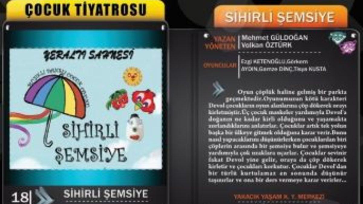 Müzik ve dansla çocukları çevre bilincini anlatan ‘Sihirli Şemsiye’ oyunu, Kartallı minikler için sahneye geliyor.Kartal Belediyesi, çocukları birbirinden güzel tiyatro oyunlarıyla buluşturmaya devam ediyor. Mehmet Güldoğan ve Volkan Öztürk’ün yazıp yönettiği başrollerinde Ezgi Ketenoğlu, Görkem Aydın, Gamze Dinç ve Tisya Kusta’nin yer aldığı 'Sihirli Şemsiye' Kartallı miniklerle buluşuyor. Müzik ve danstan oluşan çocuk oyunu, Yakacık Yaşam Kalitesini Yükseltme Merkezi’nde 18 Ocak Cumartesi saat 14.00’te ücretsiz olarak sahnelenecek.