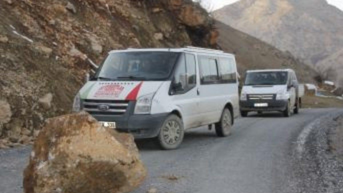 Hakkari’nin Durankaya beldesi Üzümcü köyü arasındaki karayolunda seyreden arabaların önüne büyük kayaların düşmesi sonucu yolcular...