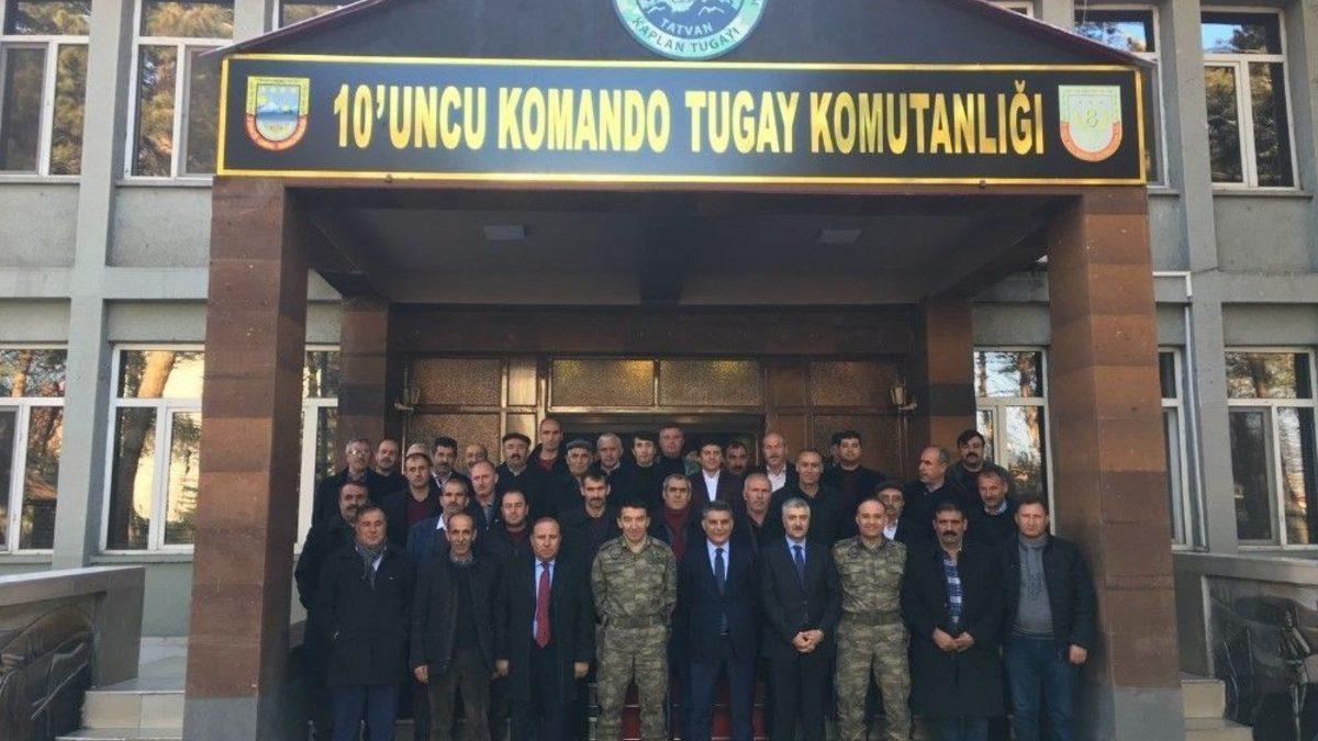 BİTLİS (İHA) – Bitlis’in Tatvan İlçe Kaymakamı Mehmet Ali Özkan, mahalle ve köy muhtarları ile birlikte Tatvan 10. Komando Tugayı’na “Başsağlığı” ziyaretinde bulundu.Suriye’de devam eden “Zeytin Dalı” Harekâtında şehit düşen Tatvan 10. Komando Tugayı emrindeki askerler için 10. Komando Tugayı’nı ziyaret eden İlçe Kaymakamı Mehmet Ali Özkan ve muhtarlar, Tugay Komutanı Tuğgeneral Tamer Atay’a “Başsağlığı” dileklerini ilettiler. Ziyarette ayrıca şehit asker için toplu olarak dua edilip Fatiha okundu. Ziyarette muhtarlar adına Tuğgeneral Tamer Atay’a “Başsağlığı” dileklerini ileten Kaymakam Mehmet Ali Özkan, “Kahraman şehitlerimize Allah’tan rahmet, Gazilerimize ise acil şifalar diliyoruz. Bizler her zaman askerlerimizin yanında, devletimizin, milletimizin ve bayrağımızın ise emrindeyiz. Bu vesile ile Allah tüm kahraman askerlerimizi korusun, Onları Allah’a emanet ediyoruz. Dualarımız her zaman onlarla olacak inşallah” dedi.10. Komando Tugayı Tuğgeneral Tamer Atay ise, ziyaretten duyduğu memnuniyeti dile getirerek, teşekkürlerini iletti.