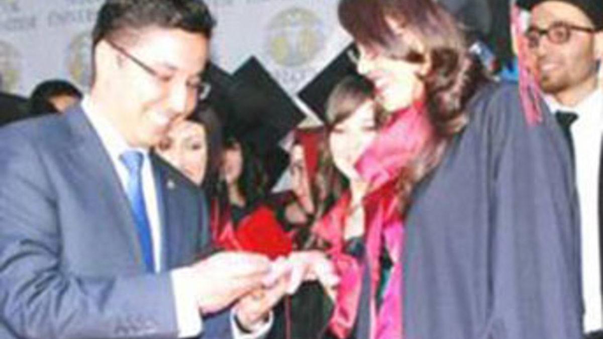 Kaymakam Ayhan Terzi, öğrencileri tek tek tebrik ederek, diplomalarını verdi. Öğrenciler arasında bulunan kız arkadaşı Gökçen Tuba Topal'a da diplomasını veren Terzi, ''Bugün burada iki mutluluğu bir arada yaşıyorum. Öncelikle mezun olduğum okuldan yeni mezun olacak meslektaşlarıma diplomalarını verme fırsatı bulduğum için ayrı bir gurur yaşadığımı belirtmek isterim. Bir diğer mutluluğum ise Gökçen Tuba Topal'ın da bugün mezun olması. Huzurlarınızda kendisine yüzük takmak istiyorum.''