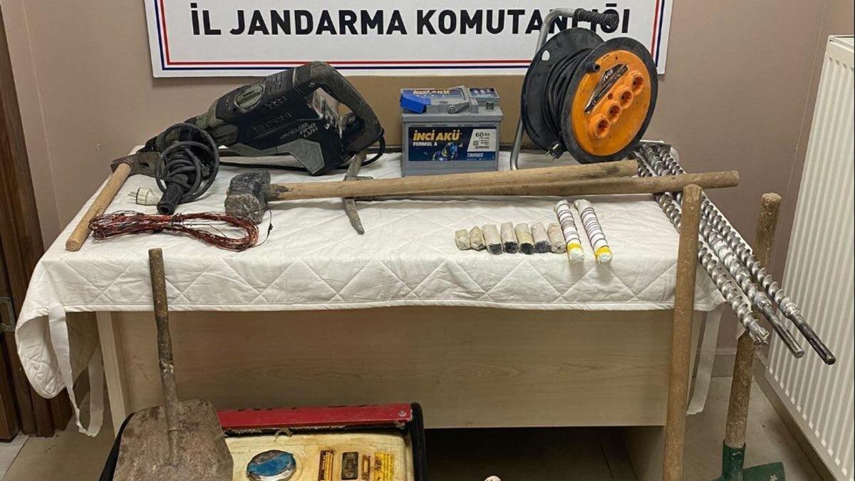 Jandarma, kazıda kullanıldığı değerlendirilen 9 dinamit lokumu, 1 jeneratör ve çok sayıda kazı malzemesine el koydu.