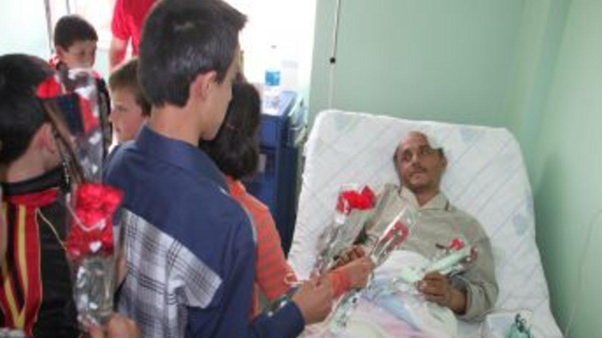 Ellerinde çiçeklerle halk otobüsü ile hastaneye gelen öğrenciler, hastane görevlileri ile TIR sürücüsün Hüseyin Sürer'in yattığı odaya geldi. Sürer' e geçmiş olsun dileklerini sunan öğrenciler, çiçekleri Hüseyin Sürer'e verdi.
