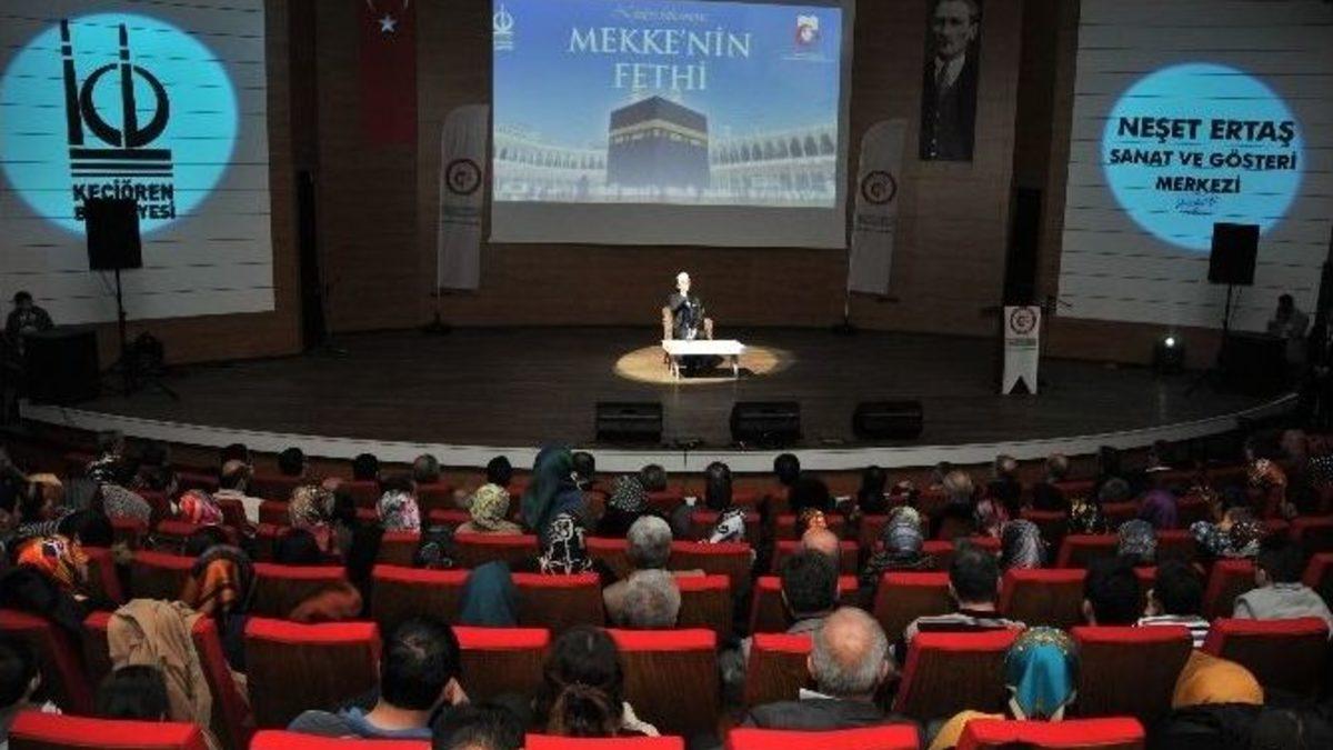 Peygamber Efendimiz Hz. Muhammed’in (S.A.S) Mekke’yi fethederek Kabe’yi putlardan temizlemesinin 1384’üncü yıl dönümü, Keçiören’de düzenlenen programla kutlandı.Neşet Ertaş Sanat ve Gösteri Merkezi’ndeki “Mekke’nin Fethi” programı, Keçiören Belediyesi ve Ankara İlim Yayma Cemiyeti Yenimahalle Gençlik Kolları’nın işbirliğiyle gerçekleştirildi. Kendi öz değerlerimize sahip çıkmak ve nefis muhasebesi yapmak adına düzenlenen programa, Ankara’nın dört bir yanından gelen çok sayıda vatandaş katıldı. Sunuculuğunu Selahattin Yağcı’nın üstlendiği program, Hafız Can Atıcı tarafından seslendirilen Kur’an-ı Kerim tilaveti ile başladı. Ardından küçük bir kız öğrencinin okuduğu “Mekke’nin Fethi” şiiri dinleyenleri duygulandırdı. Abdulkadir Şehitoğlu’nun güzel sesiyle okuduğu Kur’an tilaveti ise, salonu dolduran peygamber aşıklarının kalplerini fethetti. Daha sonra sahne alan Ensar Kardeşler, seslendirdikleri ilahilerin yanı sıra izleyenlerin de eşlik ettiği dualarla manevi atmosferi doruğa taşıdılar.Selman Şehitoğlu da Peygamber Efendimiz Hz. Muhammed’in (S.A.S) Mekke’yi fethi ile ilgili bilgiler verirken, aynı zamanda dinleyicilere nefis muhasebesi yapma imkanı sağladı. Geceyi düzenleyen dernek yöneticileri, destek ve katkılarından dolayı Keçiören Belediye Başkanı Mustafa Ak’a teşekkür ettiler.