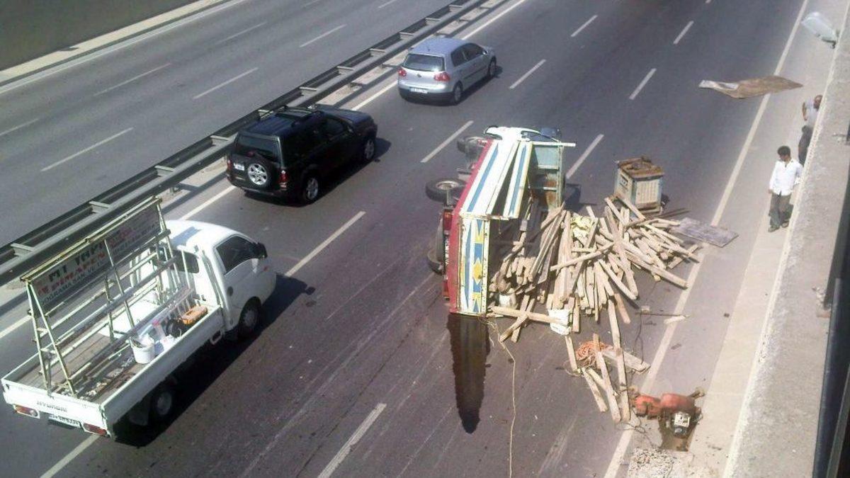 Çekmeköy’de kereste yüklü bir kamyonet seyir halindeyken kontrolden çıkıp devrildi. Kaza nedeniyle Şile Otobanı üzerinde yoğun trafik oluştu.