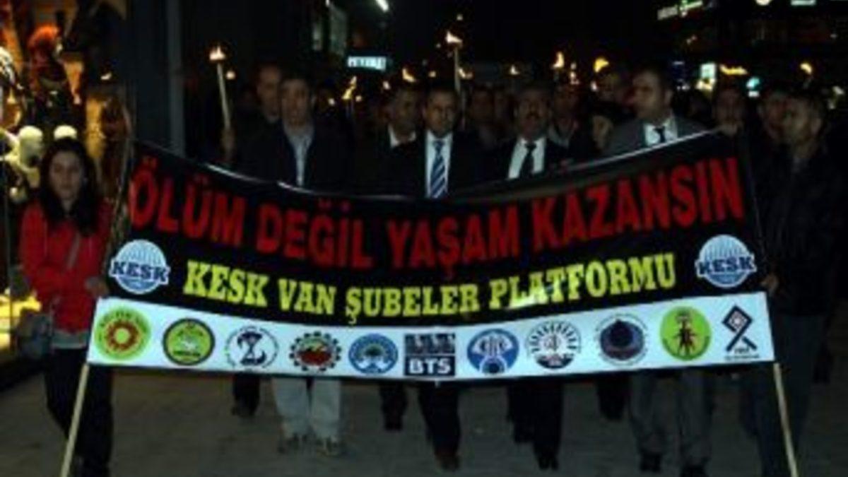 Kamu Emekçileri Sendikaları Konfederasyonu (KESK) Van Şubeler Platformu, yaşanan açlık grevlerine dikkat çekmek için meşaleli bir yürüyüş düzenledi.
