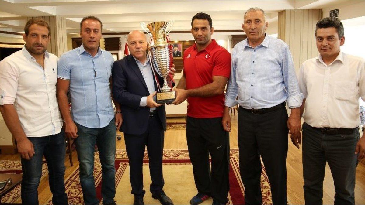 Kırkpınar Yağlı Pehlivan Güreşleri’nin yıldızı Dadaş Pehlivan Hamza Köseoğlu, Erzurum Büyükşehir Belediye Başkanı Mehmet Sekmen’i ziyaret etti. Başkan Sekmen, 656. Tarihi Kırkpınar Yağlı Pehlivan Güreşleri’nde yarı finalde İsmail Balaban’la karşılaşarak üçüncü olan Erzurumlu Hamza Köseoğlu’nu tebrik ederek, kendisinden 657. Kırkpınar Güreşleri’nde şampiyonluk sözü aldı. Sekmen, “Erzurumlu pehlivanımız, birkaç yıldır başpehlivanlıkta birinciliği kaçırdı. İnşallah bize bu sevinci 2018’de yaşatacak. Ankara’da güreş hayatına devam eden hemşehrimize başarılar diliyorum” dedi. Başkan Sekmen ayrıca Köseoğlu’nu 5. Uluslararası Altın Kemer Karakucak Güreşleri’ne davet etti. Köseoğlu da, kentte güreş sporunu zirveye taşıyan Başkan Sekmen’e teşekkür ederek, “İnşallah nasipse 657. Kırkpınar Güreşleri’nde şampiyon olup Erzurum’a bu sevinci yaşatacağım. Başkanımız Mehmet Sekmen’e güreş sporuna sunduğu büyük katkıdan ötürü şükranlarımızı sunuyoruz. Erzurum yeniden tıpkı eski günlerde olduğu gibi güreşin menbağı olacak. Buna yürekten inanıyorum” diye konuştu. Konuşmaların ardından Başkan Mehmet Sekmen, Kırkpınar Yağlı Pehlivan Güreşleri’nin üçüncüsü olan Erzurumlu pehlivan Hamza Köseoğlu’nu altınla ödüllendirdi.