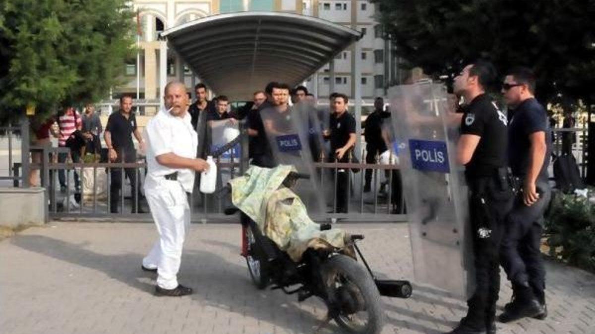 "Adliye bahçesine girişimize izin verilmediği için dışarıda toplanmıştık. Bu sırada Süleyman Harmankaya motosikletiyle adliyenin önüne geldi. Motosikletine gaz verip gürültü yapıyordu. Ardından yanımıza gelip bana ve arkadaşım Vural Köse'ye küfretti. Biz kendisiyle muhatap olmak istemedik. Bulunduğumuz yerden uzaklaştık. Bir süre sonra sanık da motosikletine binip adliye önünden ayrıldı. Aradan yarım saat kadar geçtikten sonra sanık bu kez benzin dolu bir bidonla gelip, yere döktü. Ardından benzini çakmakla tutuşturmaya çalıştı, ancak beceremedi. Ayrıca elindeki palaya benzer kesici aletle bana ve arkadaşım Vural Köse'ye saldırdı. Bunun üzerine arkadaşımla ben geri çekilmek durumunda kaldık. Daha sonra polisler gelip şahsı aldılar."