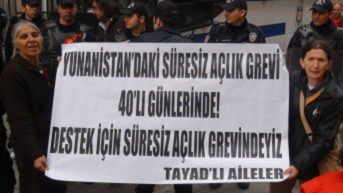 Yunanistan polisi tarafından gözaltına alınarak cezaevine gönderilen iki kişiye destek vermek için Yunanistan’ın İstanbul Başkonsolosluğu önünde eylem yapan 3 kişi gözaltına alındı.Konsolosluk önüne gelen TAYAD'lı 3 kadın, “Yunanistan’daki açlık grevi kırklı günlerinde, destek için sürekli açlık grevindeyiz” yazılı pankart açtı. Basın bildirisi okumak isteyen bir kadın eylemciyi görevli polisler uyardı. Konsolosluk önünde eylem yapamayacaklarını, bunun suç olduğunu söyleyen polislere eylemciler, İstiklal Caddesi’nde eylem yapmalarının engellenemeyeceğini savundu. Uyarının ardından eylemi bitirmeyen gruptaki kadınlar polis tarafından gözaltına alındı. Çevik Kuvvet’e ait araca bindirilmeye çalışılan kadınlar polise direndi. Kadın eylemci araç içinde de slogan atmayı sürdürdü. Olay sırasında meraklı vatandaşlar da yoğunluk oluşturdu.