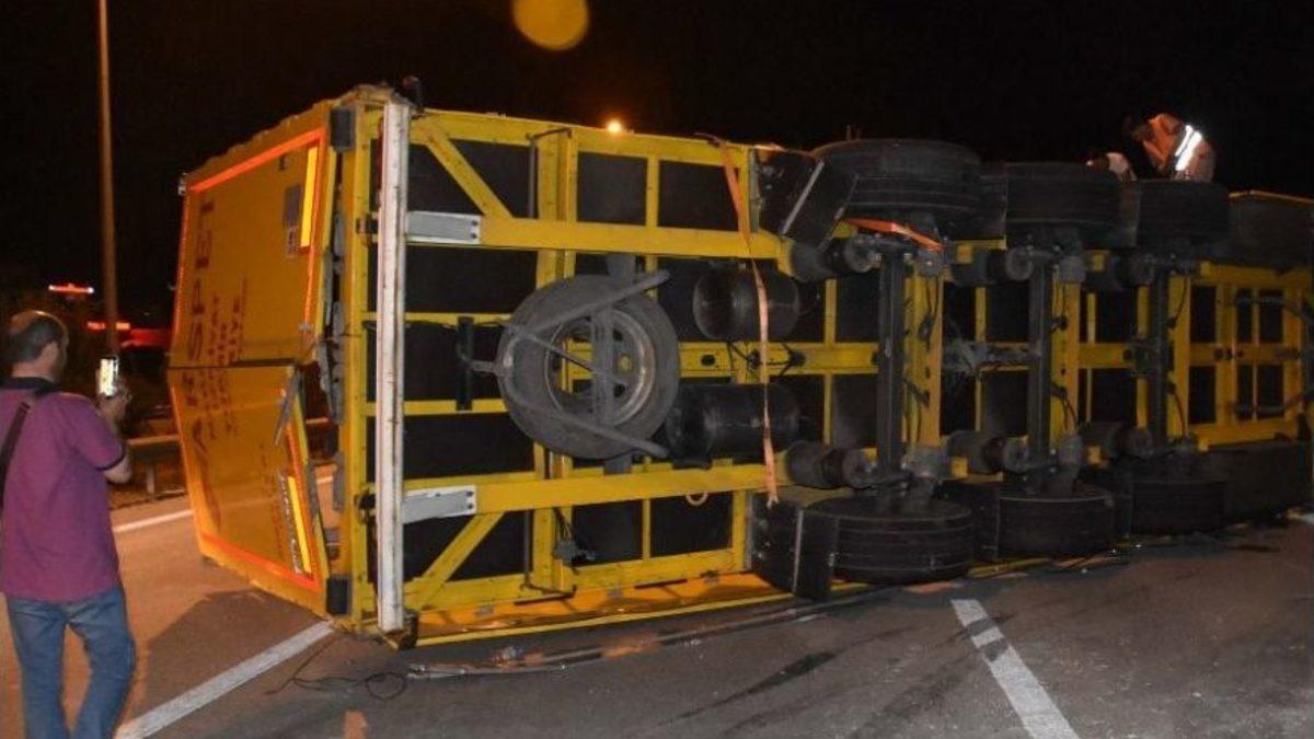 İzmir’in Narlıdere İlçesinde, kontrolden çıkan bir TIR yol ayrımındaki bariyerlere çarptı. TIR çarpmanın etkisiyle yan devrilirken, kaza da yaralanan olmadı.Kaza, dün akşam saatlerinde İzmir - Çeşme Otoyolu’nun Narlıdere Kavşağı’nda meydana geldi. Edinilen bilgiye göre, İzmir’den Çeşme istikametine seyir halinde olan Tanju Emre Kan yönetimindeki 35 EJJ 29 plakalı TIR, Narlıdere yol ayrımında kontrolden çıkarak ortadaki demir bariyerlere çarptı. TIR çarpmanın etkisiyle yan devrilirken, TIR’ın 35 AJ 4285 plakalı dorsesinde yüklü olan otomobil parçaları da yola savruldu. Kazayı gören diğer sürücülerin durumu bildirmesi üzerine olay yerine sağlık ekipleri sevk edildi. Kısa bir süre olay yerine intikal eden sağlık ekiplerinin yaptığı kontrolde, şoför Tanju Emre Kan’ın herhangi bir yara almadığı tespit edildi. Öte yandan kaza sonucu yol trafiğe kapanırken, TIR’ın bağlı olduğu şirket yetkilileri olay yerine bir TIR ve forklift göndererek yola savrulan parçaları başka bir TIR’a aktardı.