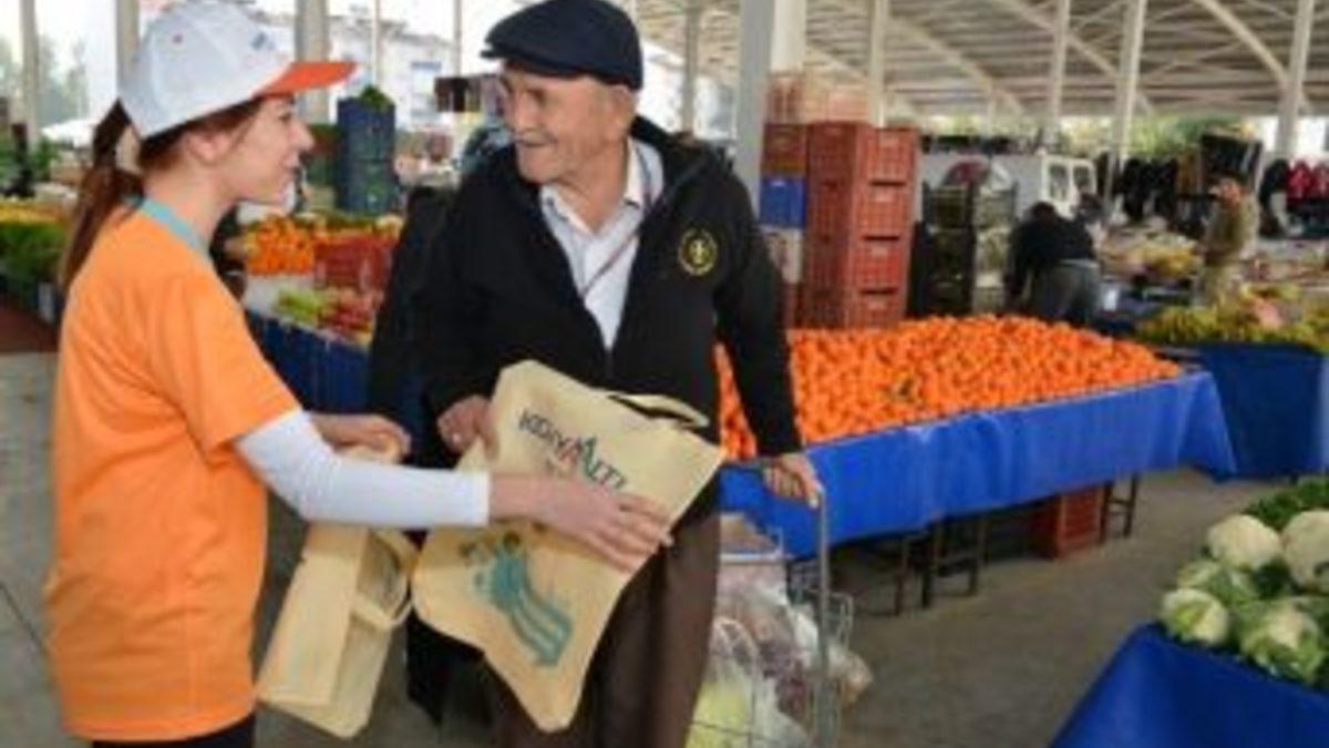 Konyaaltı Belediyesi, naylon poşetlerin kullanımını azaltmak için pazar yerlerinde vatandaşa ücretsiz bez torba dağıtıyor.Konyaaltı Belediyesi,...
