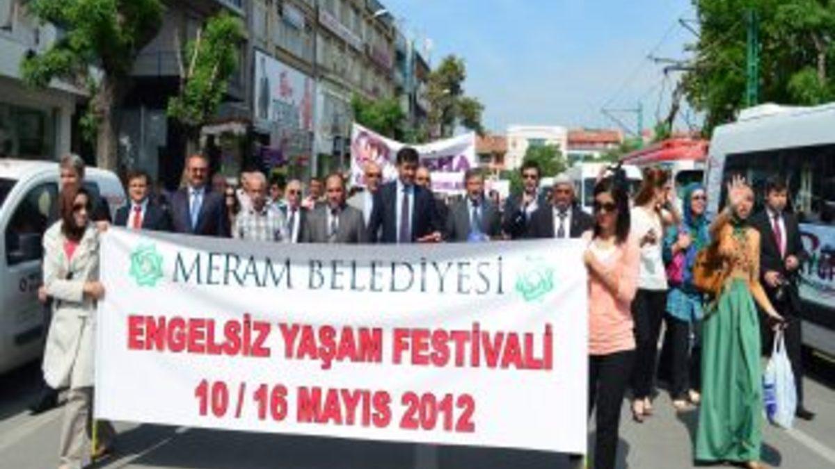 Konya'nın merkez Meram İlçe Belediyesi öncülüğünde Meram Kent Konseyi Gençlik Meclisi ve Özel Rehabilitasyon Merkezleri işbirliğiyle düzenlenen Engelsiz Yaşam Festivali, Zafer Meydanından Kayalıpark'a kadar olan güzergahta kortej yürüyüşü ile başladı.