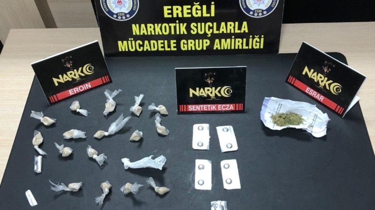 Ereğli Emniyet Müdürlüğü Narkotik Suçlarla Mücadele Amirliği ekipleri, kentte uyuşturucu satışı yapan kişilere yönelik başlattığı çalışmada, 3 şüpheliyi gözaltına aldı. Ekiplerce yapılan aramalarda şüphelilere ait olduğu değerlendirilen araç ve adreslerde, toplamda 32.17 gram eroin, 2.61 gram esrar, 9 adet uyuşturucu hap maddesi ele geçirildi. Emniyette yapılan sorgulamalarının ardından mahkemeye çıkartılan zanlılardan 1 şahıs uyuşturucu madde ticareti yapmak suçundan tutuklanarak cezaevine gönderildi.