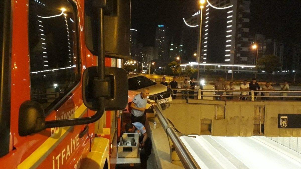 Ankara’da kontrolden çıkan otomobil, köprülü kavşağın bariyerinde asılı kaldı. Bariyerden dökülen beton parçalarının kafasına isabet ettiği bir kişi yaralandı.Kaza, gece saatlerinde Yenimahalle’de meydana geldi. Edinilen bilgilere göre; Bağdat Caddesi üzerinden Ulus istikametinde ilerleyen 34 EV 6434 plakalı otomobil, Anadolu Bulvarı ile Bağdat Caddesi’nin kesiştiği kavşakta sürücüsünün direksiyon hakimiyetini kaybetmesi sonucu, yoldan çıkarak Gimat alt geçidinin bariyerlerine çıktı. Bariyerlerde asılı kalarak metrelerce yükseklikten düşmekten son anda kurtulan otomobilin sürücüsü, kazayı yara almadan atlattı. Kaza esnasında Anadolu Bulvarı üzerinde ilerleyen 06 SP 002 plakalı otomobilin alt geçitten geçtiği sırada bariyerlerden sökülen beton ve demir parçalarının altında kaldı. Araçtaki yolculardan Y.D., başına beton parçası isabet etmesi sonucu yaralandı.Kazanın ilgililere bildirilmesinin ardından bölgeye çok sayıda polis, itfaiye ve sağlık ekibi sevk edildi. Y.D., sağlık ekiplerince kaza yerinde yapılan ilk müdahalelerin ardından ambulansla hastaneye götürülerek tedavi altına alındı. Bariyerlerde asılı kalan otomobili kurtarmak için çalışma başlatan itfaiye erleri, alt geçidin sarkan demir korkuluklarını kesti. Polis ekipleri, kesilen korkulukların düşmesi ihtimaline karşı, Anadolu Bulvarı’nı bir süreliğine tek taraflı olarak trafiğe kapattı. İtfaiye ekiplerinin çalışmalarını tamamlamasının ardından yol tekrar trafiğe açıldı. Asılı kalan otomobil, çekiciye yüklenerek otoparka kaldırıldı.Polis ekipleri, kaza hakkında inceleme başlattı.