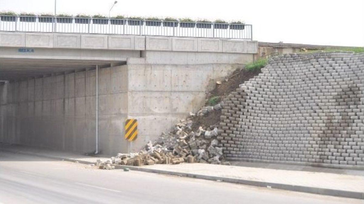 Bursa’nın İnegöl ilçesinde Hikmet Şahin Köprülü Kavşağı’nda toprak kayması meydana geldi. Köprünün istinat duvarının bir kısmı çöktü.Bursa Valisi Münir Karaloğlu tarafından geçen yıl temeli atılan İnegöl Organize Sanayi Bölgesi’ndeki Hikmet Şahin Köprülü Kavşağı’nın önce Ankara-Bursa istikameti trafiğe açıldı. İnegöl’ün transit yol güzergahında olması sebebiyle trafik akışını rahatlatmak için temeli atılan kavşak, Karayolları Bölge Müdürlüğü tarafından inşa edildi. Trafik yoğunluğunun en fazla yaşandığı bölgede yapılın köprülü kavşak, 4 kollu yonca görünümlü, 77 dönümlük arazi üzerine kuruldu. 17,6 milyon liraya mal olan kavşağın yaklaşık 32 dönümü yeşil alan olarak ayrılırken, hem şehirlerarası seyreden araçların hem de yayaların kullandığı noktaya yapılan kavşakla, birçok kazanın önüne geçilmesi hesaplandı.Köprülü kavşağın OSB istikametine gidişinde istinat duvarı çöktü. Yağmur sebebiyle çöken istinat duvarındaki taşlar yayaların kullandığı kaldırımı kapattı. Yol üzerine dökülen taşlar tehlike arz ederken, İnegöl Belediyesi yetkilileri, kavşağın Bursa Büyükşehir Belediyesi tarafından yapıldığını ve durumun Büyükşehir’e iletildiğini söyledi.