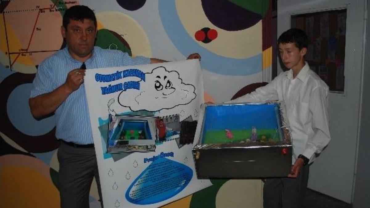 Plevne İlköğretim Okulu 7/B sınıfı öğrencisi Özay Tuncay(14) otomatik kapanan yağmur çadırı projesiyle Çanakkale bölgesinden seçilen iki projeden birisi olma başarısını göstererek Ankara’da açılacak ulusal sergiye onur konuğu olarak davet edildi. Öğretmeni Ali İzzet Sarılar ile birlikte projelerini Ankara’da sergileyecek olan Özay Tuncay yeni buluşu hakkında yaptığı açıklamada “Hazırladığım projede aniden yağmur yağması ihtimallerinde neler yapılabileceğini düşündüm. Oluşturduğum çamaşır çadırında otomatik kapanma metodu sayesinde yağmur yağsa bile çamaşırlar artık ıslanmayacak. Hazırladığım projede teras ve bahçeli evlerde yer alan koltuk ve kanepe gibi eşyalarda kuru kalabilecek. Ayrıca kullanım alanı geniş olup tarlalarda, açık depolarda bulunan saman balyası çeşitli beyaz eşya ve mobilyaların yağmurdan zarar görmesini engellemek içinde kullanılacak bir projedir. Sistem hakkında bilgi vermem gerekirse kurulacak çadırın enerji devresine bağlı motor isteğe bağlı olarak çalıştırılabiliyor. Evin veya bahçenin üzerine koyulacak içi tuz dolu haznenin içindeki kabloların ucu kesik kalacak şekilde bırakılıyor. Burada elektrik tellerinin ucu birbirine değmeyecek fakat tuz seviyesinin üzerinde duracak. Yağmur yağdığı anda tuzlu haznenin üzerine su gelmeye başlayacak. Tuzlu su elektriği ileten bir özellikte olması sebebiyle sistemi devreye sokacak. Yağmur başladıktan birkaç saniye sonra çadırımız kapanacak. Enerji olmadığı alanlarda da kullanılabilecek” şeklinde konuştu. Okul Müdürü Kemalettin Kocaoğlu öğrencinin kendi düşüncesiyle meydana getirdiği proje için tebrik ederek “Ankara’da ilimizi en iyi şekilde temsil edeceğine inanıyoruz” dedi.