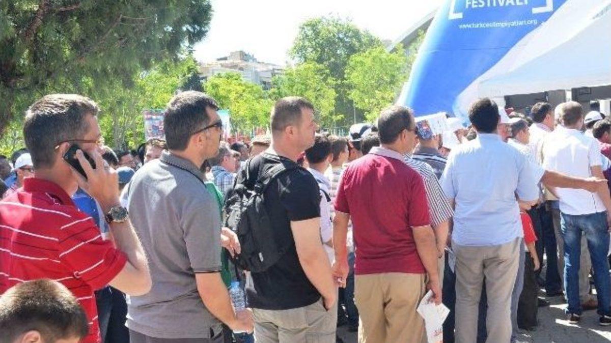 İzmir Fuar Alanı'nda girebilmek için Kültürpark girişine kurulan turnikelerin önünde uzun kuyruklar oluştuğu gözlendi.