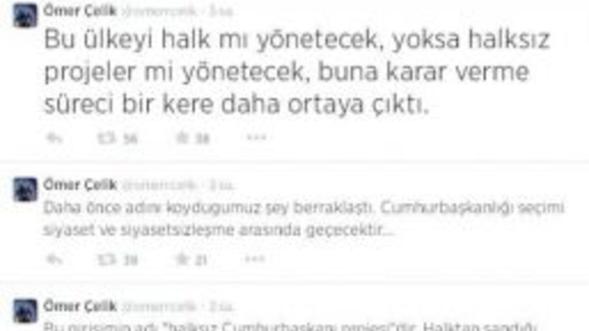 Kültür ve Turizm Bakanı Ömer Çelik, “CHP ve MHP, cumhurbaşkanını halkın seçmesini istemiyor. Sandığa ipotek koymak istiyor” dedi.Kültür ve Turizm Bakanı Ömer Çelik, sosyal paylaşım sitesi Twitter üzerinden cumhurbaşkanı adayı olan Başbakan Erdoğan’ın, adaylık sürecinde Başbakanlıktan istifa etmesi gerektiğini öne süren CHP ve MHP liderlerini eleştirdi. Geçmişteki askeri vesayet yerine, şimdi ‘çatı vesayeti’ türetildiğini ifade eden Çelik, şunları kaydetti:“CHP'nin Başbakanımızın Başbakanlıktan istifa etmesi gerektiği iddiasıyla ortaya koyduğu siyasi iflası MHP bir başka teşebbüse çevirdi. Bahçeli, açıkça yargı yoluyla Başbakanımızın cumhurbaşkanlığı adaylığını engelleme girişimine imza attı. Böylece tablo netleşti. CHP ve MHP, Cumhurbaşkanı’nı halkın seçmesini istemiyor. Sandığa ipotek koymak istiyor.Geçmişte askeri vesayet ile cumhurbaşkanı seçimi sürecine ipotek koyma girişimi, en son 367 krizi ile güncellenmişti. 367 krizi geri tepti ve halk bunu yapanları daha sonra ağır biçimde cezalandırdı. Şimdi ise askeri vesayet yerine ‘çatı vesayeti’ türedi. Çatı vesayetini kurma yolunda öncü CHP idi, MHP ise CHP projesinin parçası olmuştu. MHP tabanı hiç dikkate alınmadan bu proje tabana dayatıldı. Şimdi ise çatı vesayeti adına Başbakanımızın adaylığını engelleme girişimini Bahçeli üstlendi. Ne hazindir ki, darbelerden mağdur olmuş MHP tabanı, şimdi yöneticilerinin darbe dönemlerimi aratmayan projeleri ile karşı karşıya. Siyasi tarihimizde meşru Cumhurbaşkanı adaylarının askeri vesayet ile engellenmesine dair pek çok örnek vardır. Bugün Bahçeli buna yeni ek yaptı. Bahçeli kendi çatı vesayeti projelerinin adayının dışındaki adayların engellenmesi için 27 Mayıs ve 12 Eylül tarzı bir girişime imza attı. Bu girişimin adı ‘halksız cumhurbaşkanı projesi’dir. Halktan sandığı kaçırma gayretidir. Milli irade korkusudur. Cevabını halk verecektir.Daha önce adını koyduğumuz şey berraklaştı. Cumhurbaşkanlığı seçimi siyaset ve siyasetsizleşme arasında geçecektir. Bu ülkeyi halk mı yönetecek, yoksa halksız projeler mi yönetecek, buna karar verme süreci bir kere daha ortaya çıktı. ‘Halkın devleti’ diyenler siyasete ve tabana, ‘devletin halkı’ diyenler vesayete ve çatıya dayanıyor. Halkımız karar verecek.”