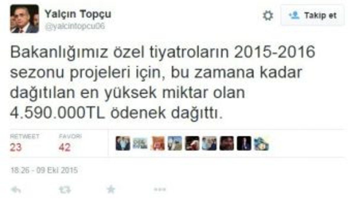 Kültür ve Turizm Bakanlığı, özel tiyatroların 2015-2016 projeleri için 4 milyon 590 bin TL destek sağladı.Kültür ve Turizm Bakanı Yalçın Topçu, rekor desteği Twitter hesabından, “Bakanlığımız özel tiyatroların 2015-2016 sezonu projeleri için bu zamana kadar dağıtılan en yüksek miktar olan 4.590.000 TL ödenek dağıttı” sözleriyle duyurdu. Bakanlık böylece bugüne kadar özel tiyatrolara sağlanan en yüksek destekle bir rekora imza attı.Bakanlık konuyla ilgili yazılı açıklama yayımladı. Kültür ve Turizm Bakanlığı’nca özel tiyatroların projelerine yapılan yardımlardan yararlanmak üzere 123 profesyonel, 43 çocuk oyunu, 142 amatör ve 75 geleneksel kategoride olmak üzere toplam 383 özel tiyatronun başvuru yaptığı bildirildi. Açıklamaya göre, özel tiyatroların başvuruları, Kültür ve Turizm Bakanlığı Müsteşarı Prof. Dr. A. Halûk Dursun’un başkanlığında Müsteşar Yardımcısı Nihat Gül, Güzel Sanatlar Genel Müdürü Doç. Dr. Murat Salim Tokaç, Devlet Tiyatroları Genel Müdür V. A. Nejat Birecik, Yakın Doğu Üniversitesi Sahne Sanatları Fakültesi Dekan V. Prof. Dr. Bozkurt Kuruç, İstanbul Üniversitesi Devlet Konservatuarı Tiyatro Anasanat Dalı Başkanı Prof. Dr. Suat Nazmi Özturna ve sanatçı H. Ulvi Alacakaptan’dan oluşan Değerlendirme Komisyonu tarafından incelendi. Değerlendirme Komisyonu, bu zamana kadar bir sanat sezonu için dağıtılan en yüksek miktar olan toplam 4 milyon 590 bin lira ödeneğin 92 profesyonel, 40 çocuk oyunu, 54 amatör ve 49 geleneksel olmak üzere bu zamana kadar bir sanat sezonunda projesine destek sağlanan en çok sayı olan 235 özel tiyatronun projesine dağıtılmasına karar verdi.Değerlendirme Komisyonu tarafından Türk tiyatrosunu bütün yönleriyle desteklemek amacıyla son yıllarda olduğu gibi Türk oyun yazarlarının eserlerine öncelik verildi. Profesyonel tiyatrolar kategorisinde yardım yapılması uygun görülen projelerden Türk oyun yazarlarına ait olanlarına bütçe imkânları çerçevesinde ek bir maddi katkı yapılması sağlandı. Açıklamanın devamında şu ifadelere yer verildi:“Bu uygulamanın son yıllarda Bakanlıkça başvuru yapan özel tiyatroların daha çok Türk oyun yazarlarına ait eserleri tercih etmesine neden olduğu ve bunun sonucunda da Türk tiyatrosunun gelişmesine önemli bir katkı sağlandığı görülmektedir. 2002 yılında profesyonel kategoride başvuru yapan özel tiyatroların yaklaşık yüzde 55’i Türk oyun yazarlarına ait eserleri tercih etmişken, 2015 yılında bu oran yüzde 75’in üzerinde bir seviyeye yükseldi. Bu yıl yeni girişimlerin desteklenerek bu alana da çoğulcu ve demokratik bir işleyiş kazandırmak amacıyla 18 profesyonel, 4 çocuk oyunu, 7 amatör ve 1 geleneksel kategoride olmak üzere toplam 30 özel tiyatro Bakanlığın yardımlarından ilk kez yararlanmaya hak kazandı. Bununla birlikte, daha önce amatör kategoride başvuru yapmakta iken profesyonel kategoride proje sunan 4 özel tiyatro, tiyatroların profesyonelleşerek kurumsal bir kimlik kazanmasını sağlamak adına desteklendi.”