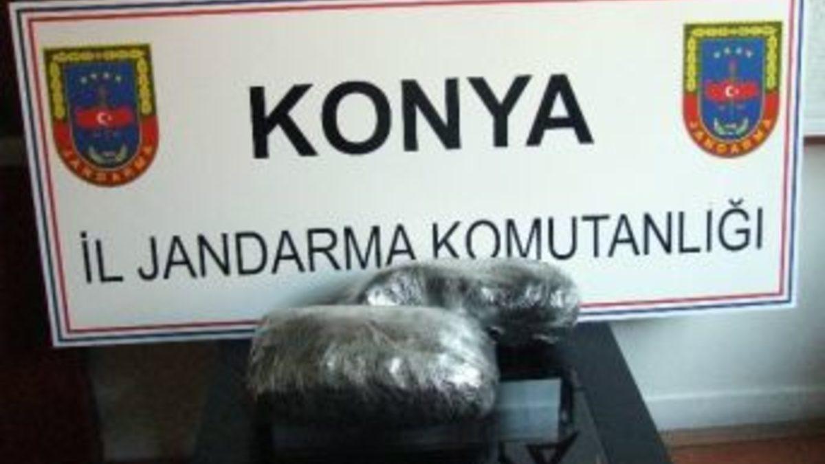 Konya’nın Kulu ilçesinde jandarma tarafından bir yolcu otobüsünde yapılan aramada 5 kilogram esrar ele geçirildi.Edinilen bilgiye göre, Kulu İlçe Jandarma Komutanlığı ekipleri Aksaray-Ankara yol güzergahında Türkiye Şoförler ve Otomobilciler Federasyonu yakınlarında yaptıkları uygulama sırasında Mersin’den Ankara’ya giden yolcu otobüsünü durdurdu. Yolcuların kimlik kontrollerini yapan jandarma, narkotik köpeği eşliğinde de bagajda arama yaptı. Yapılan aramalar sonucunda bir valizin içerisinde 2 ve 3 kiloluk poşetler içerisinde esrar ele geçirildi. Valizin sahibi olduğu öne sürülen M.C.K. gözaltını alındı. Bu sırada yapılan GTB sorgulamasında da çeşitli suçlardan aranan C.K. de yakalandı. Şüpheliler gerekli işlemlerin yapılabilmesi için jandarma komutanlığına götürüldü.