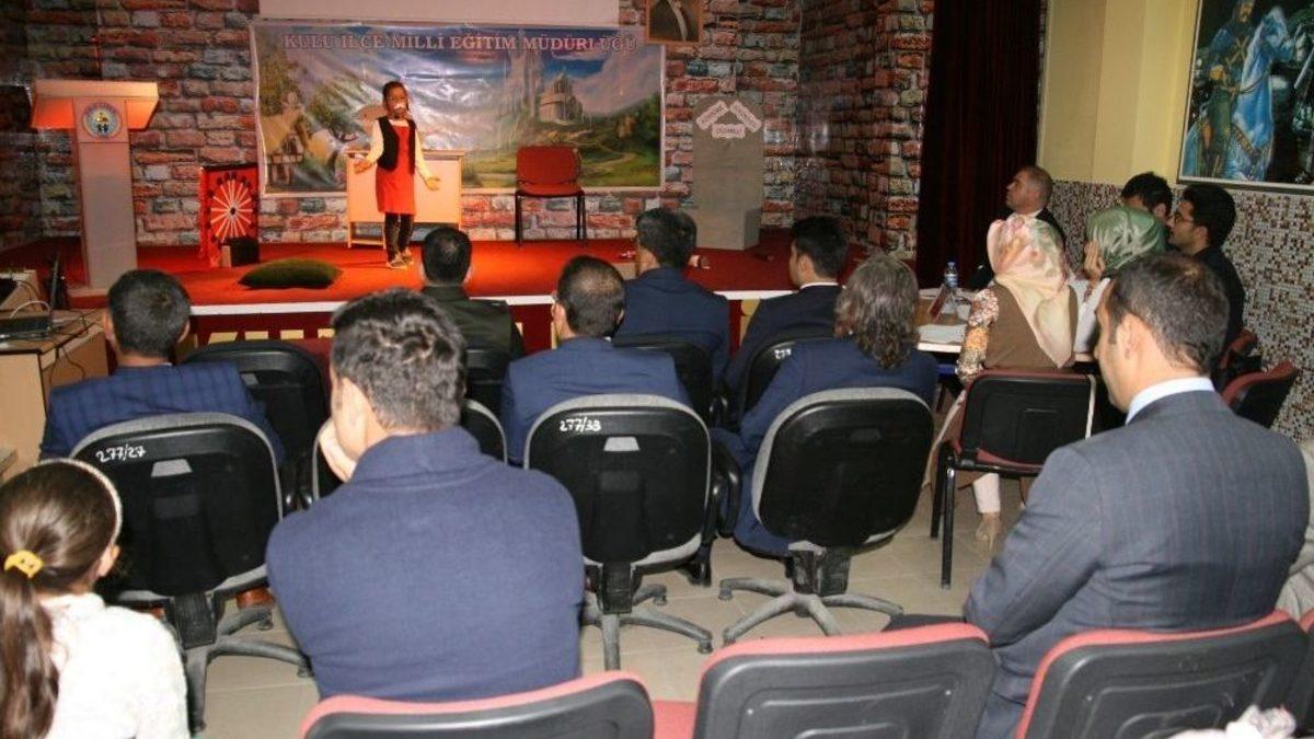 Konya’nın Kulu ilçesinde ‘Bana Bir Masal Anlat Proje Yarışması’ yapıldı.İlçe Milli Eğitim Müdürlüğünün yerel projelerinden biri olan ilkokullar arası "Bana bir masal anlat projesi" Kulu geneli final yarışması Düden Anadolu Lisesi çok amaçlı konferans salonunda yapıldı. Öğrencilerin kendilerini ifade etme, toplum önünde konuşma becerileri ve öz güvenlerinin geliştirilmesi amacıyla hazırlanan proje Kulu’da bulunan 9 merkez ilkokulunun katılımlarıyla tamamlandı. Proje kapsamında kül kedisinden, pamuk prenses ve yedi cücelere kadar birçok masal sahnelendi. Yarışma sonrasında jüri tarafından yapılan puanlamada, Fatih İlkokulundan Hatice Taştepe 481 puanla birinci, Merkez İlkokulundan Nisanur Akgün 468 puanla ikinci olurken, Alpaslan İlkokulundan Mihrican Ayşe Açıcı ise 454 puanla üçüncü oldu. Dereceye girenlere ödülleri okul müdürleri ve öğretmenleri tarafından dağıtıldı.Yarışmayı, İlçe Garnizon Komutanı Mustafa Erkaraman, İlçe Milli Eğitim Müdürü Sultan Ahmet Kaymak, Emniyet Müdür Vekili İsmail Orhan, Kredi ve Yurtlar Müdürü Seyit Ahmet Serbest ve okul müdürleri ile öğrenciler ve aileleri izledi.