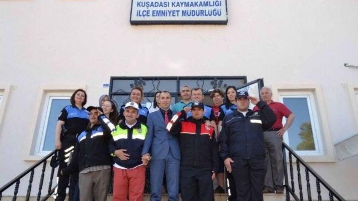 Kuşadası’nda eğitim gören engelliler, bir günlüğüne polis oldu.Kuşadası Engellileri Koruma Derneği Erdoğan Öven Engelliler Okulu’nun öğrencileri, polis kıyafetleri giydikten sonra ilk iş olarak Kuşadası Emniyet Müdürü Özgür Batçıoğlu’nu makamında ziyaret etti. Batçıoğlu tarafından ağırlanan ve kendi elleriyle ikramda bulunulan engelli öğrenciler, daha sonra Kuşadası polisinin uygulama yaptığı noktalara götürüldü.Kuşadası Emniyet Müdürlüğü tarafından düzenlenen etkinlikte, Toplum Destekli Poliklik Amirliği ekipleri ve trafik polisleri ile denetimlere katılan engelli öğrenciler, polis kıyafetleri giyerek uygulama yaparken, sürücülere emniyet kemerlerini takmaları ve engelliler için ayrılan alanlara park yapmamaları konusunda uyarılarda bulundu.Etkinlikte konuşan Kuşadası Emniyet Müdürü Özgür Batçıoğlu, engelli öğrencilerin hayallerini bir günlük de olsa gerçekleştirmek istediklerini belirterek, benzer sosyal projeleri düzenlemeye devam edeceklerini söyledi.