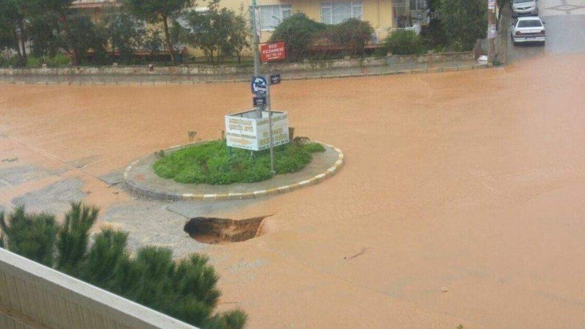 İzmir’de sabahın erken saatlerinden itibaren etkisini gösteren kuvvetli sağanak yağış, Menemen’de asfalt yolda büyük bir göçük oluşmasına neden oldu.Sabah saatlerinden itibaren İzmir’de hayatı felç eden kuvvetli sağanak yağış, İzmir’in Menemen ilçesi İnönü Mahallesinde bulunan kavşakta göçüğe neden oldu. Sürücülerin dikkati sayesinde herhangi bir kaza meydana gelmedi.Menemen’de bulunan Dokuz Eylül ilk ve orta okulunun bahçesi de yağmurdan nasibini aldı. Okulun bahçesi sular altında kalırken, ders arasına çıkan öğrenciler paçalarını sıvayarak kendilerince önlem aldı.