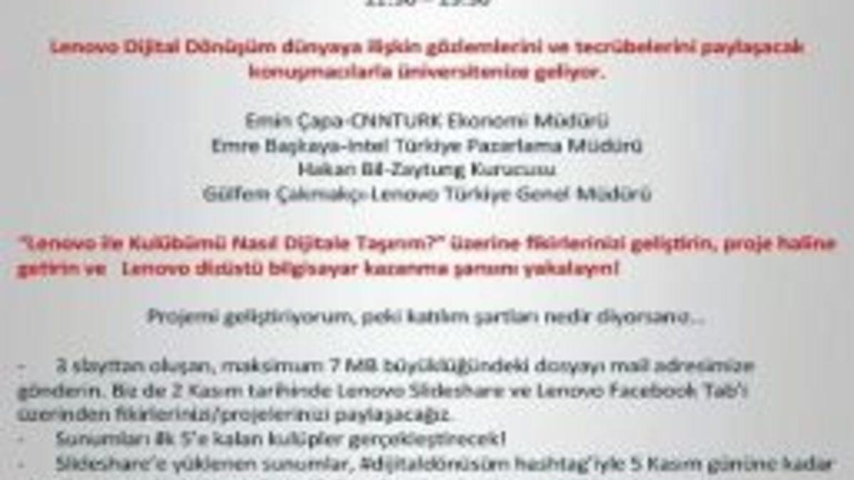 Basın mensuplarına proje hakkında bilgi veren Lenovo Türkiye Genel Müdürü Gülfem Çakmakçı, Anadalu Üniversitesi'nde öğrenciler ile birlikte gerçekleştirilecek olan toplantıda 1. gelen kulübe de Lenovo dizüstü bilgisayar hediye edeceklerini duyurdu.