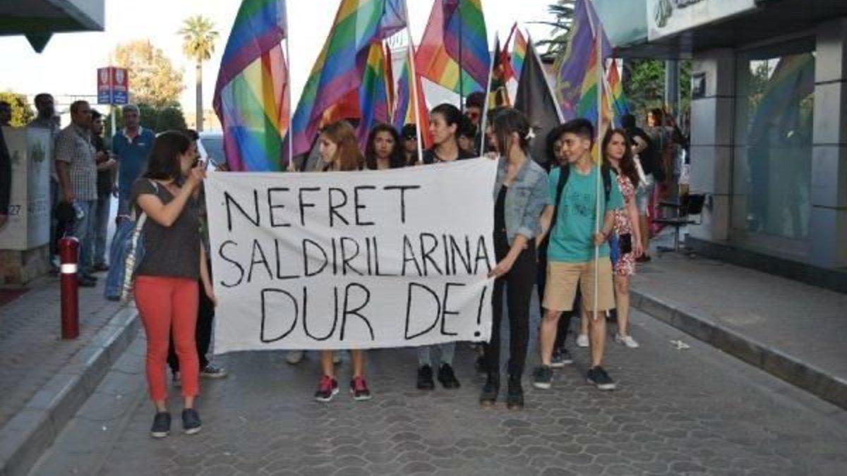 Azat YILDIZ/İZMİR, Alsancak Bornova Sokağı'nda bir araya gelen İzmir LGBT'li grup, İstanbul, Kocaeli ve İzmir'de bıçaklanan trans arkadaşları için eylem yaptı. "Trans cinayetleri politiktir," "Aşk, hürriyet uzak olsun devlet," "Susma haykır translar vardır" sloganlarıyla yürüyen grup üyeleri Türkan Saylan Kültür Merkezi'ni kadar yürüdü. Grup adına açıklama yapan Gamze Yıldırım, şunları söyledi: