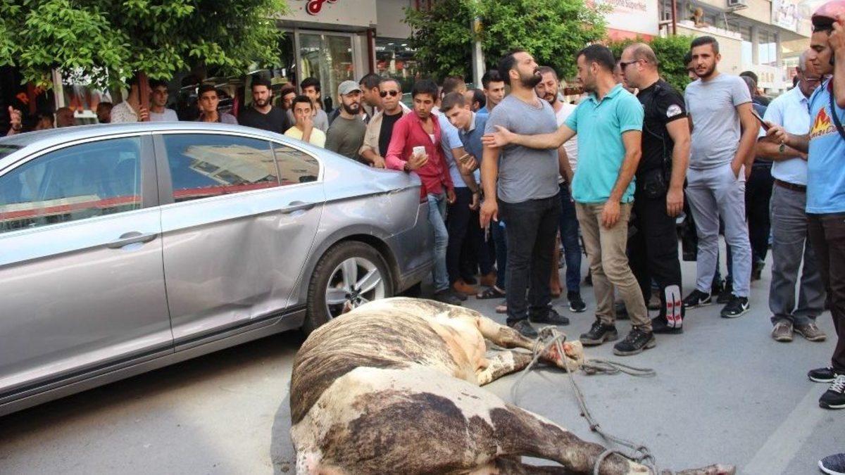 Hatay’ın İskenderun ilçesinde Güney Amerika’dan ithal edilen angus cinsi büyükbaş hayvanlardan biri, limandan kaçarak kent merkezine girdi. Uyuşturucu iğne ile etkisiz hale getirilen angus bazı araçlara da zarar verdi.Deniz yoluyla Hatay’ın İskenderun ilçesindeki limana getirilen Güney Amerika ülkelerinden ithal edilen 10 bin angus cinsi büyükbaş hayvandan biri kaçarak şehre girdi.Kaçan angus şehir merkezindeki birkaç araca da hasar verdi. Uyuşturucu iğne atan tabancayla vurularak uyutulan angus iş makinesiyle kent merkezinden götürüldü.Vatandaşlara korku dolu anlar yaşatan angus kentte meraklı bir kalabalığın toplanmasına neden oldu. Vatandaşlar bir yandan kaçarken bir yandan da cep telefonlarıyla olayı kayda aldılar.Polis ekipleri de kimsenin zarar görmemesi için yoğun bir çaba harcadı.