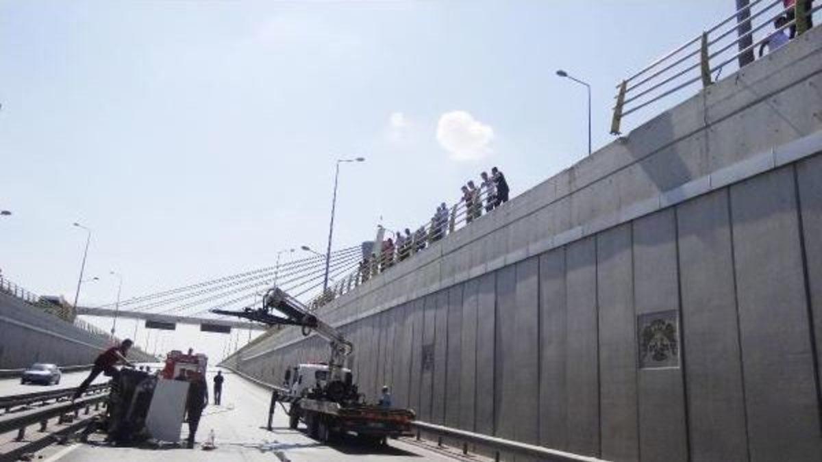 İsmail AKKAYA / KONYA, Kaza, bugün saat 13.40 sıralarında Konya- Ankara Karayolu Ayakkabıcılar Köprülüğü Kavşağı'nda meydana geldi. Usema Kalkan yönetimindeki 42 VU 691 plakalı otomobil, belirlenemeyen nedenle kontrolden çıkıp, bariyerleri kırıp yaklaşık 5 metre yükseklikten alt geçide uçtu. Kazada sürücü Usema Kalkan yaralandı. Ağır yaralı Kalkan ambulansla, Numune Hastanesi'ne kaldırıldı. Şans eseri kaza sırasında alt geçitten her hangi bir aracın geçmiyor olması büyük bir faciayı önledi.