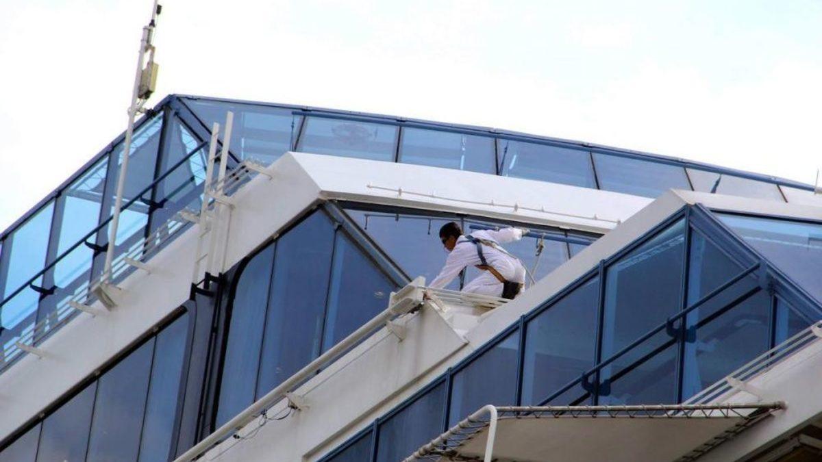 SİNOP - Kruvaziyer turizmi kapsamında Sinop Limanı'na demirleyen lüks yolcu gemisi "Nautica"da cam temizliği yapıldı. Kuşadası'ndan gelip Trabzon'a gidecek 165 metre uzunluğunda,30 bin 277 gross tonluk lüks gemiden yolcular kenti gezmek için ayrılınca personel de temizlik çalışması yaptı. Geminin ön tarafında, kaptan köşkünün de bulunduğu ve yerden yaklaşık 30 metre yükseklikteki camları güvenlik kemerleri takarak silen görevlilerin çabası dikkat çekti. Gemi akşam saatlerinde Sinop Limanı'ndan ayrılacak.