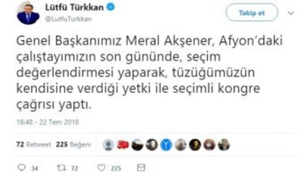 İYİ Parti Genel Başkan Yardımcısı Lütfü Türkkan, Afyonkarahisar’daki çalıştayın ardından seçimli kongreye gideceklerini açıkladı.İYİ Parti Genel Başkan Yardımcısı Lütfü Türkkan, Twitter hesabından yaptığı açıklamada, "Genel Başkanımız Meral Akşener, Afyon’daki çalıştayımızın son gününde seçim değerlendirmesi yaparak, tüzüğümüzün kendisine verdiği yetki ile seçimli kongre çağrısı yaptı" ifadelerine yer verdi. Türkkan açıklamasında herhangi bir tarihe yer vermedi.Öte yandan Meral Akşener’in çalıştayın yapıldığı otelden ayrıldığı öğrenildi.