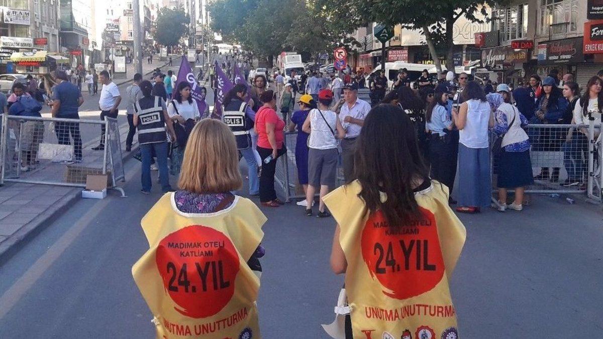 Sivas’ta 1993 yılında Pir Sultan Abdal etkinliklerine gelenlerin konakladığı Madımak Oteli’nin ateşe verilmesi sonucu hayatını kaybeden 33 aydın ve 2 otel görevlisi için Başkent’te anma etkinliği yapıldı.Başkent’te Madımak’ta hayatını kaybedenler için Kolej Meydanı’nda anma etkinliği gerçekleştirildi. Kurtuluş ve Kızılay Güvenpark’ta toplanan siyasi parti, sivil toplum kuruluşları ve dernek üyeleri, anmanın yapılacağı Kolej Meydanı’na yürüdü. Meydana gelen vatandaşlar, alan girişlerine konulan arama noktalarında polis ekipleri tarafından detaylı bir şekilde arandı. Özellikle kadınların çantalarında bulunan deodorant ve kozmetik eşyalar alana alınmadı.Kolej Meydanı’na kurulan platformda, 1993 yılında Sivas’a Pir Sultan Abdal etkinliklerine gelenlerin konakladığı Madımak Oteli’nin ateşe verilmesi sonucu yaşanan olayların 24. yıldönümünde hayatını kaybeden 33 aydın ve 2 otel görevlisi için konuşmalar yapıldı.Anma etkinliği boyunca alınan yoğun güvenlik önlemlerine bir polis helikopteri de havadan destek verdi. (DK-Y)