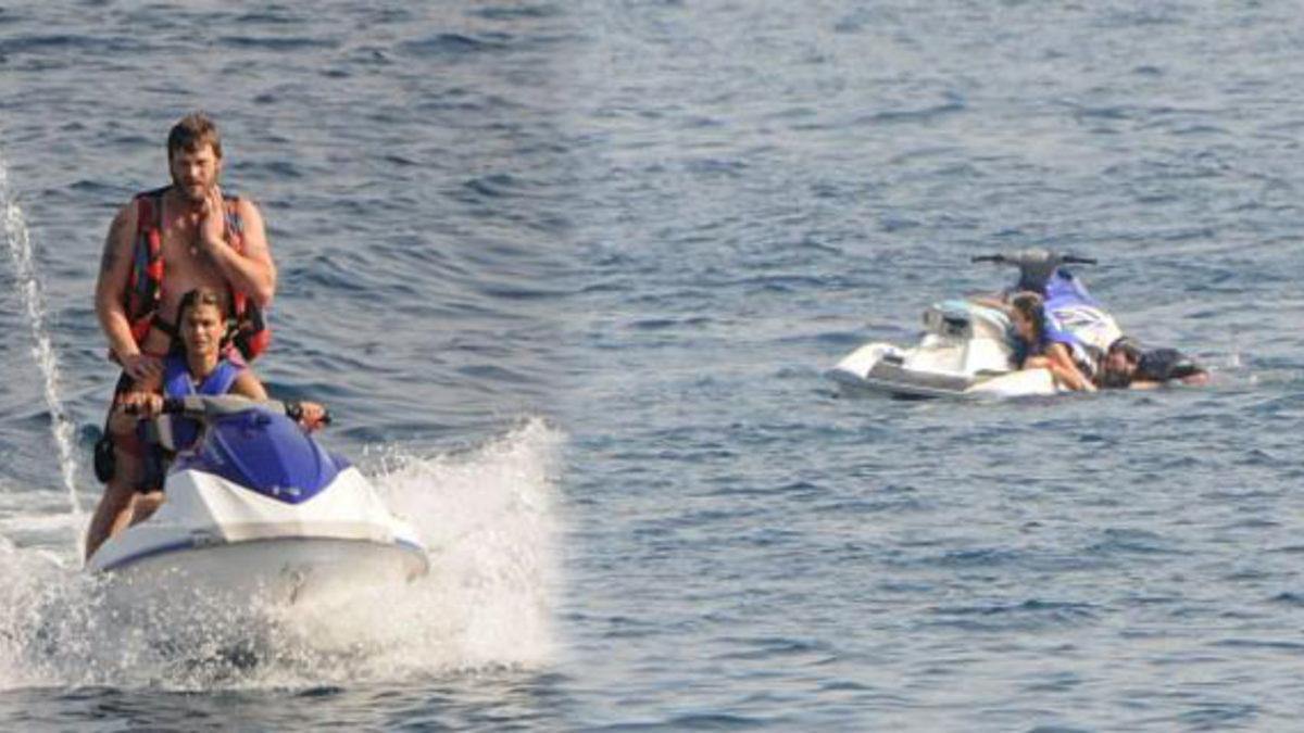 Ancak yakışıklı oyuncu jet-ski'yi kullanmakta zorluk çekince, ablasıyla birlikte birkaç kez suya düştü. Acemiliğini kısa sürede üzerinden atan Tatlıtuğ, daha sonra yeğenini de alarak mavi sulara açıldı.