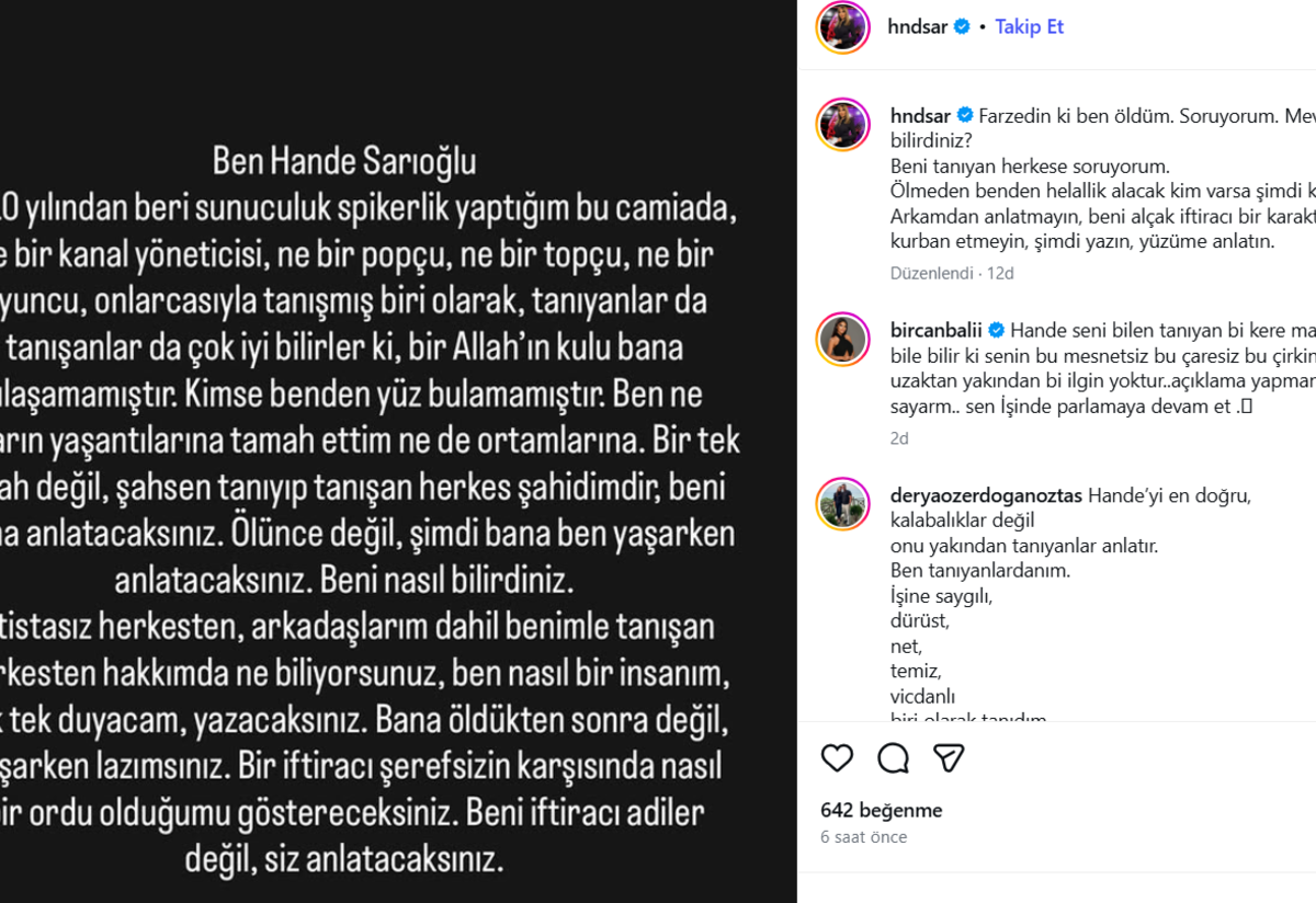 Hande Sarıoğlu paylaşımına "İstisnasız herkesten, arkadaşlarım dahil benimle tanışan herkesten hakkımda ne biliyorsunuz, ben nasıl bir insanım, tek tek duyacağım, yazacaksınız. Bana öldükten sonra değil, yaşarken lazımsınız. Bir iftiracı şerefsizin karşısında nasıl bir ordu olduğumu göstereceksiniz. Beni iftiracı adiler değil, siz anlatacaksınız" diyerek başladı.