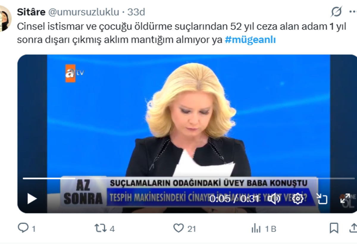 Müge Anlı "Biz işin içinden çıkamadık. Cinsel istismardan 22 yıl, çocuğu kasten öldürmekten 30 yıl ceza alıyor yargıtay bunu onuyor ama dışarıda ama nasıl dışarıda? 52 yıl ceza almış ama nasıl çıkıyor? Çok enteresan bir konu bu" dedi.