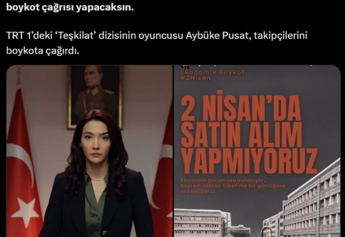 TRT'de yayımlanan Teşkilat dizisinde rol alan Aybüke Pusat, 2 Nisan boykotuna katılım çağrısı içeren bir paylaşım yaparak gündeme geldi. Aybüke Pusat'ın boykot paylaşımını kısa süre sonra silmesi de gözlerden kaçmadı.