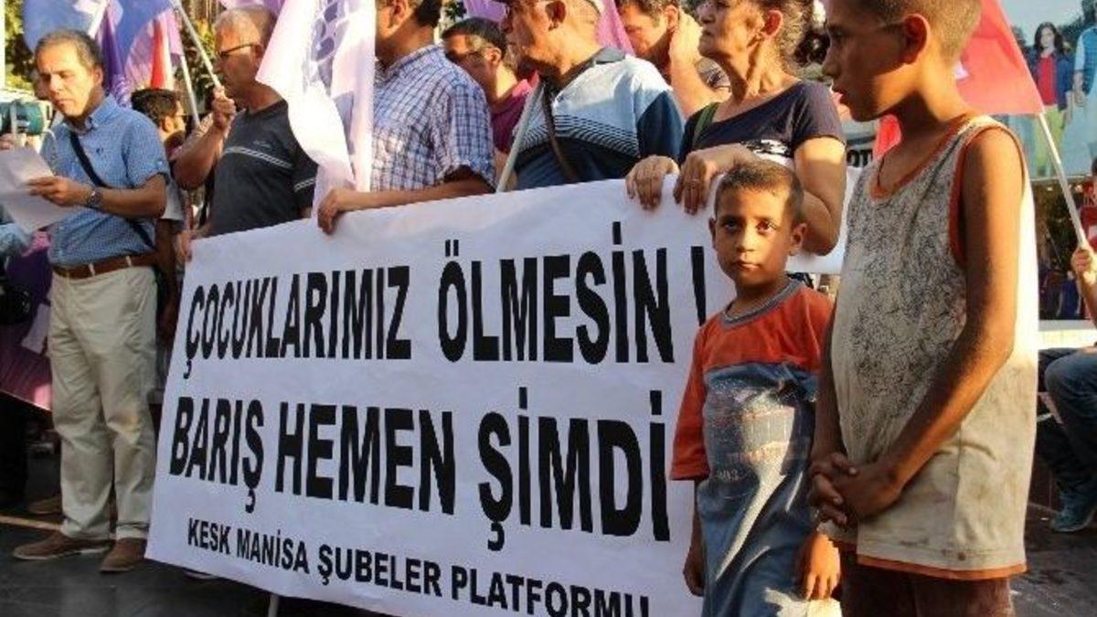 KESK Manisa Şubeler Platformu tarafından “1 Eylül Dünya Barış Günü” nedeniyle Manisa’da basın açıklaması düzenlendi.Manisa’nın Şehzadeler ilçesi Manolya Meydanında gerçekleşen KESK’in basın açıklamasına HDP ve CHP’den de destek geldi. KESK Şubeler Platformu Dönem Sözcüsü Eğitim-Sen Manisa Şube Başkanı Metin Demirel, “Türkiye’nin orta yerine ateş düşmüştür. Ateş düştüğü yeri yakıyor ama herkesi yakıyor. İktidarı, siyasileri barışa zorlamak için AKP’lisi de, MHP’lisi de, CHP’lisi de, HDP’lisi de, sosyalisti de herkes, savaşa karşı çıkmalı, ayaklanmalıyız. Göz göre göre gelen bu ölümler, bu cenazeler artık gelmesin demeliyiz” dedi.Basın açıklaması sırasında Manolya Meydanının çevresinde çok sayıda polis geniş güvenlik önlemi aldı.
